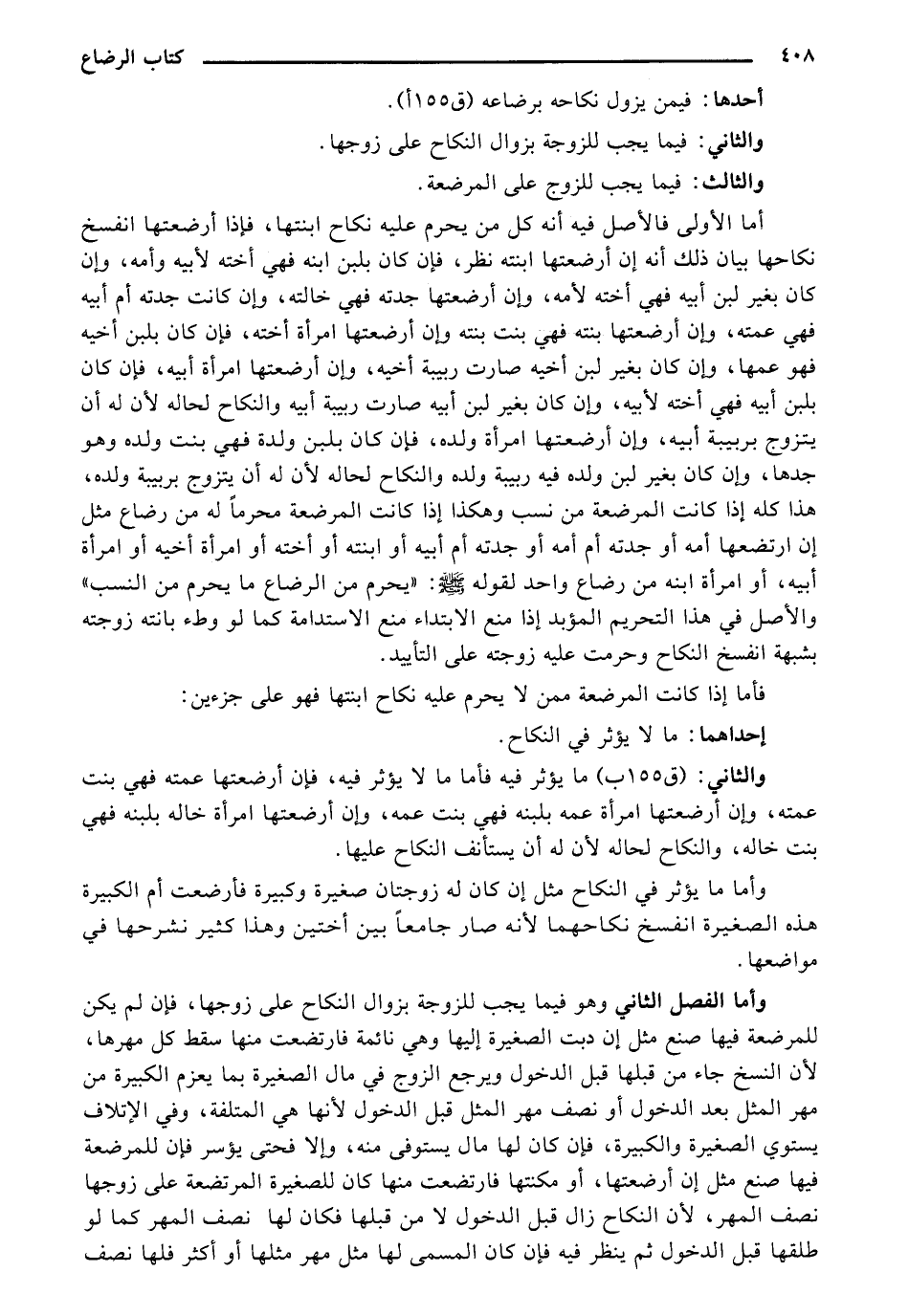وأما الفصل الثاني وهو فيما يجب للزوجة بزوال النكاح على زوجها، فإن لم يكن للمرضعة فيها صنع مثل إن دبت الصغيرة إليها وهي نائمة فارتضعت منها سقط كل مهرها، لأن النسخ جاء من قبلها قبل الدخول ويرجع الزوج في مال الصغيرة بما يعزم الكبيرة من مهر المثل بعد الدخول أو نصف مهر المثل قبل الدخول لأنها هي المتلفة، وفي الإتلاف يستوي الصغيرة والكبيرة، فإن كان لها مال يستوفي منه، وإلا فحتى يؤسر فإن للمرضعة فيها صنع مثل إن أرضعتها، أو مكنتها فارتضعت منها كان للصغيرة المرتضعة على زوجها نصف المهر، لأن النكاح زال قبل الدخول لا من قبلها فكان لها نصف المهر كما لو طلقها قبل الدخول ثم ينظر فيه فإن كان المسمى لها مثل مهر مثلها أو أكثر فلها نصف