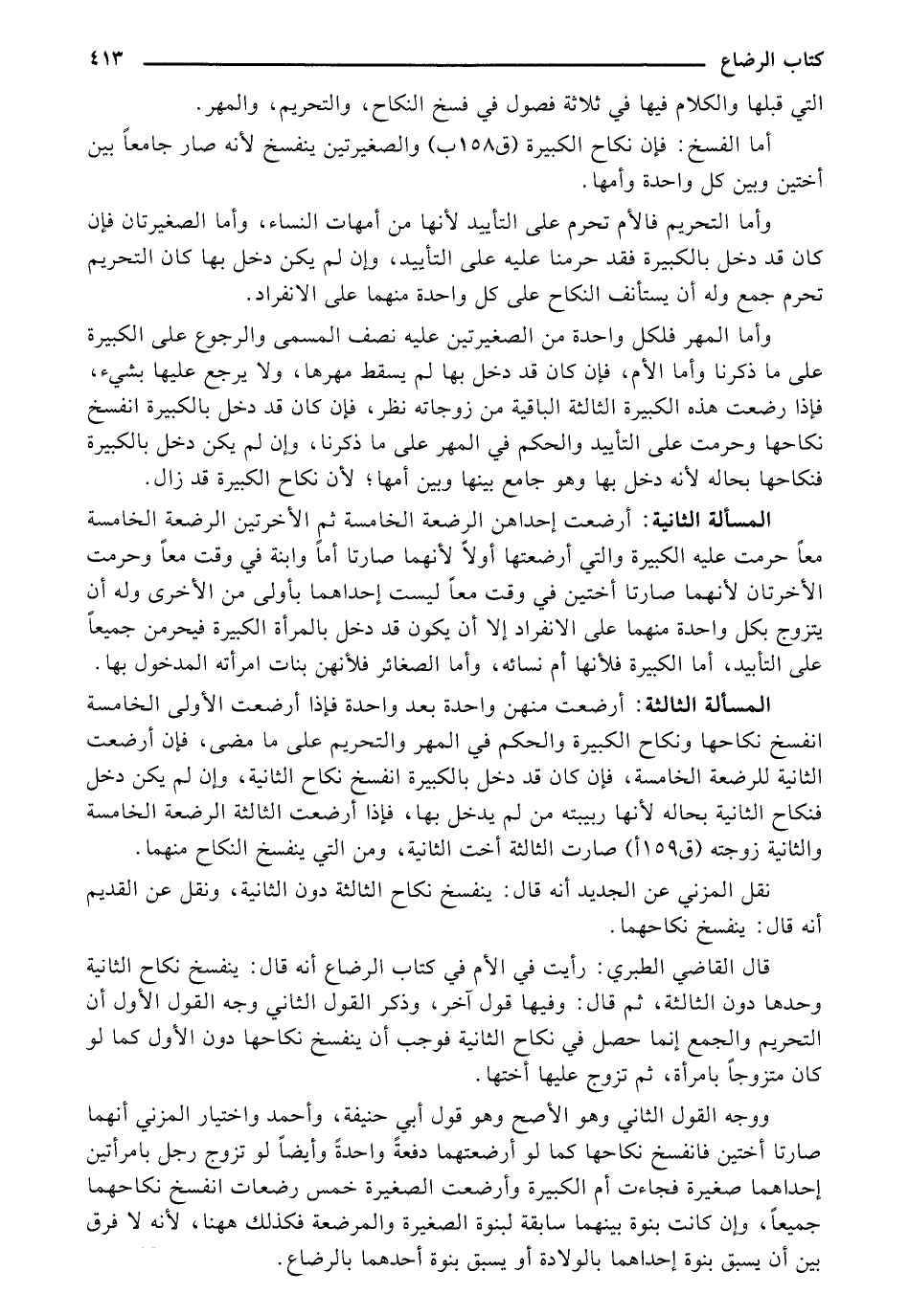المسألة الثانية: أرضعت إحداهن الرضعة الخامسة ثم الأخرتين الرضعة الخامسة معا حرمت عليه الكبيرة والتي أرضعتها أولا لأنهما صارتا أما وابنة في وقت معا وحرمت الأخرتان لأنهما صارتا أختين في وقت معا ليست إحداهما بأولى من الأخرى وله أن يتزوج بكل واحدة منهما على الانفراد إلا أن يكون قد دخل بالمرأة الكبيرة فيحرمن جميعا على التأبيد، أما الكبيرة فلأنها أم نسائه، وأما الصغائر فلأنهن بنات امرأته المدخول بها.