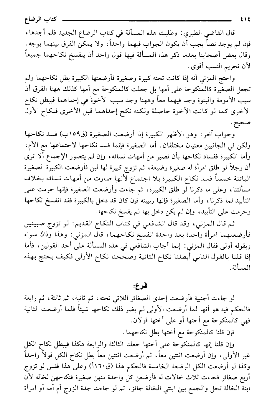 ثم قال المزني، وقد قال الشافعي في كتاب النكاح القديم: لو تزوج صبيتين فأرضعتهما امرأة واحدة بعد واحدة انفسخ نكاحهما، قال المزني: وهذا وذاك سواء وبقوله أولى فقال المزني: إنما أجاب الشافعي في هذه المسألة على أحد القولين، فأما إذا قلنا بالقول الثاني أبطلنا نكاح الثانية وصححنا نكاح الأولى فكيف يحتج بهذه المسألة.