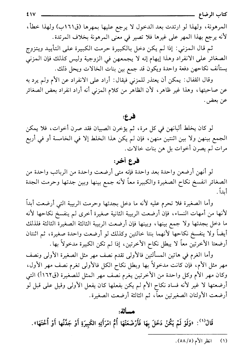 ثم قال المزني: إذا لم يكن دخل بالكبيرة حرمت الكبيرة على التأبيد ويتزوج الصغائر على الانفراد وهذا إيهام إنه لا بجمعهن في الزوجية وليس كذلك فإن المزني يستأنف نكاحهن دفعة واحدة ويكون قد جمع يبين بنات الخالات ويحل ذلك.