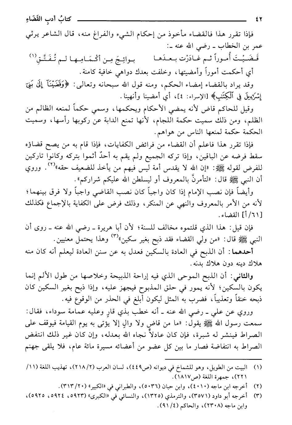 فإذا تقرر هذا فالقضاء مأخوذ من إحكام الشيء والفراغ منه؛ قال الشاعر يرثى عمر بن الخطاب - رضي الله عنه-: