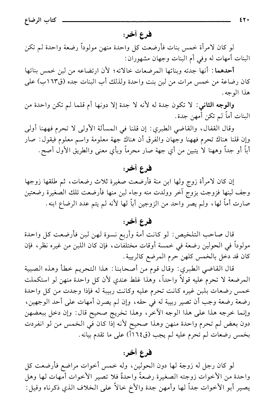 قال القاضي الطبري: وقال قوم من أصحابنا: هذا التحريم خطأ وهذه الصبية المرضعة لا تحرم عليه قولا واحدا، وهذا غلط عندي لأن كل واحدة منهن لو استكملت خمس رضعات بلبن غيره كانت تحرم عليه وكانت ربيبة له فإذا وجدت من كل واحدة رضعة رضعه وجب أن تصير ربيبة له في حقه، وإن لم يصرن أمهات على أحد الوجهين، وإنما خرجه هذا على هذا الوجه الآخر، وهذا تخريج صحيح قال: وإن دخل ببعضهن دون بعض لم تحرم واحدة منهن وهذا صحيح لأنه إذا كان في الخمس من لو انفردت بخمس رضعات لم تحرم عليه لم يجب [ق 164 أ] على ما تقدم بيانه.