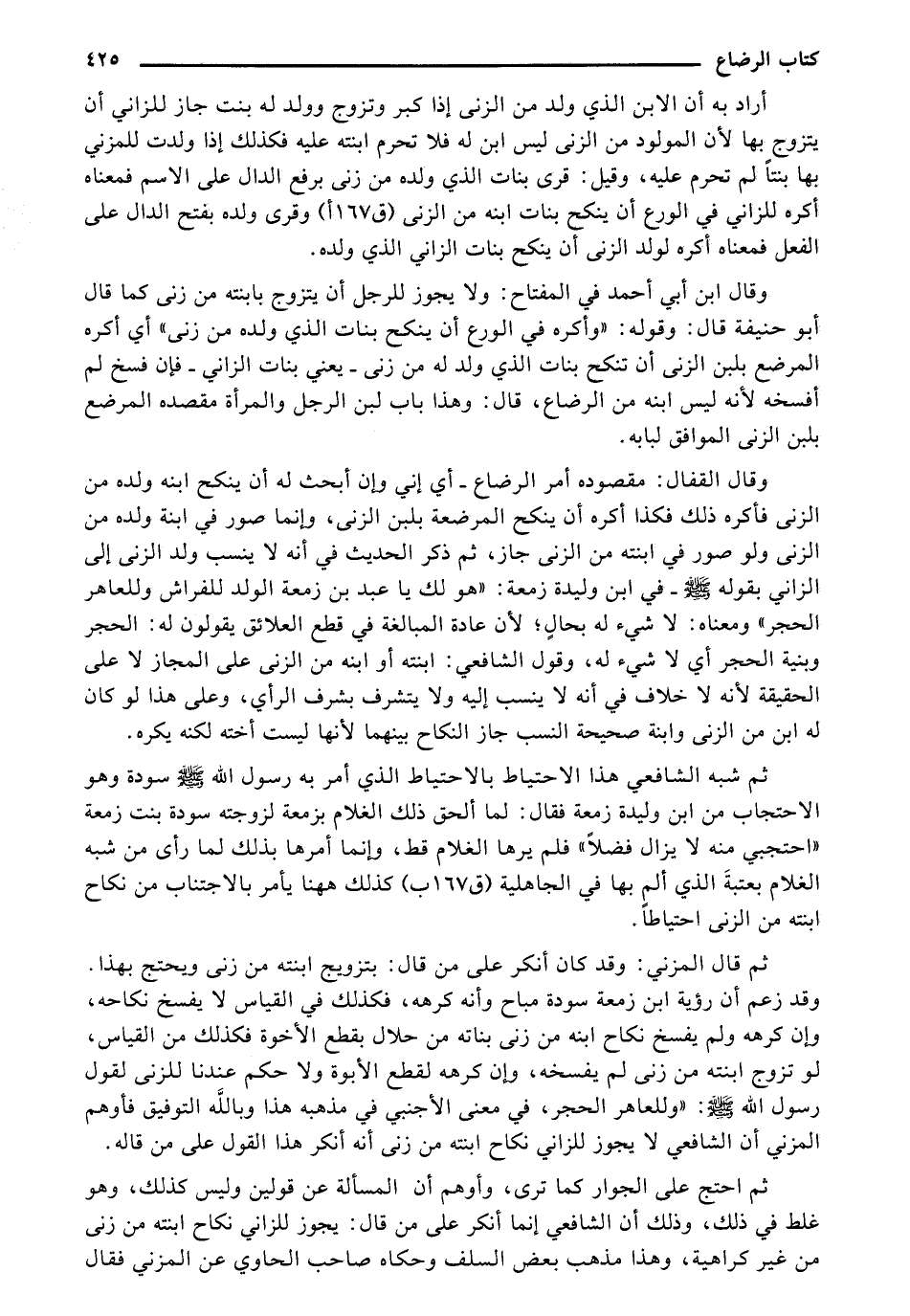 ثم شبه الشافعي هذا الاحتياط بالاحتياط الذي أمر به رسول الله - صلى الله عليه وسلم - سودة وهو الاحتجاب من ابن وليدة زمعة فقال: لما ألحق ذلك الغلام بزمعة لزوجته سودة بنت زمعة " احتجبي منه لا يزال فضلا" فلم يرها الغلام قط، وإنما أمرها بذلك لما رأى من شبه الغلام بعتبة الذي ألم بها في الجاهلية [ق 167 ب] كذلك هاهنا يأمر بالاجتناب من نكاح ابنته من الزنى احتياطا.