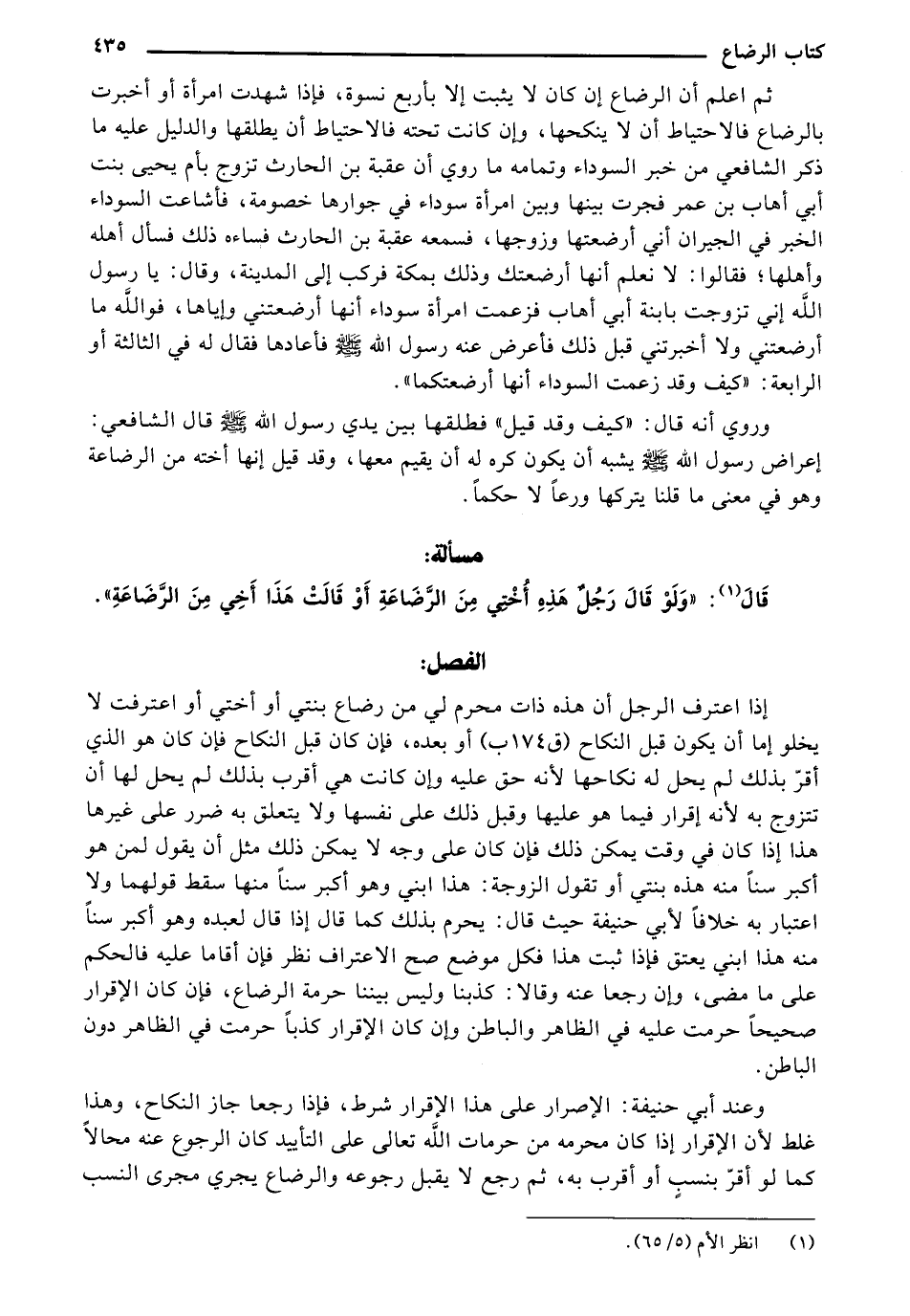 إذا اعترف الرجل أن هذه ذات محرم لي من رضاع بنتي أو أختي أو اعترفت لا يخلو إما أن يكون قبل النكاح [ق 174 ب] أو بعده، فإن كان قبل النكاح فإن كان هو الذي أقر بذلك لم يحل له نكاحها لأنه حق عليه وإن كانت هي أقرب بذلك لم يحل لها أن تتزوج به لأنه إقرار فيما هو عليها وقبل ذلك على نفسها ولا يتعلق به ضرر على غيرها هذا إذا كان في وقت يمكن ذلك فإن كان على وجه لا يمكن ذلك مثل أن يقول لمن هو أكبر سناً منه هذه بنتي أو تقول الزوجة: هذا ابني وهو أكبر سناً منها سقط قولهما ولا اعتبار به خلافاً لأبي حنيفة حيث قال: يحرم بذلك كما قال إذا قال لعبده وهو أكبر سناً منه هذا ابني يعتق فإذا ثبت هذا فكل موضع صح الاعتراف نظر فإن أقاما عليه فالحكم على ما مضى، وإن رجعا عنه وقالا: كذبنا وليس بيننا حرمة الرضاع، فإن كان الإقرار صحيحاً حرمت عليه في الظاهر والباطن وإن كان الإقرار كذباً حرمت في الظاهر دون الباطن.