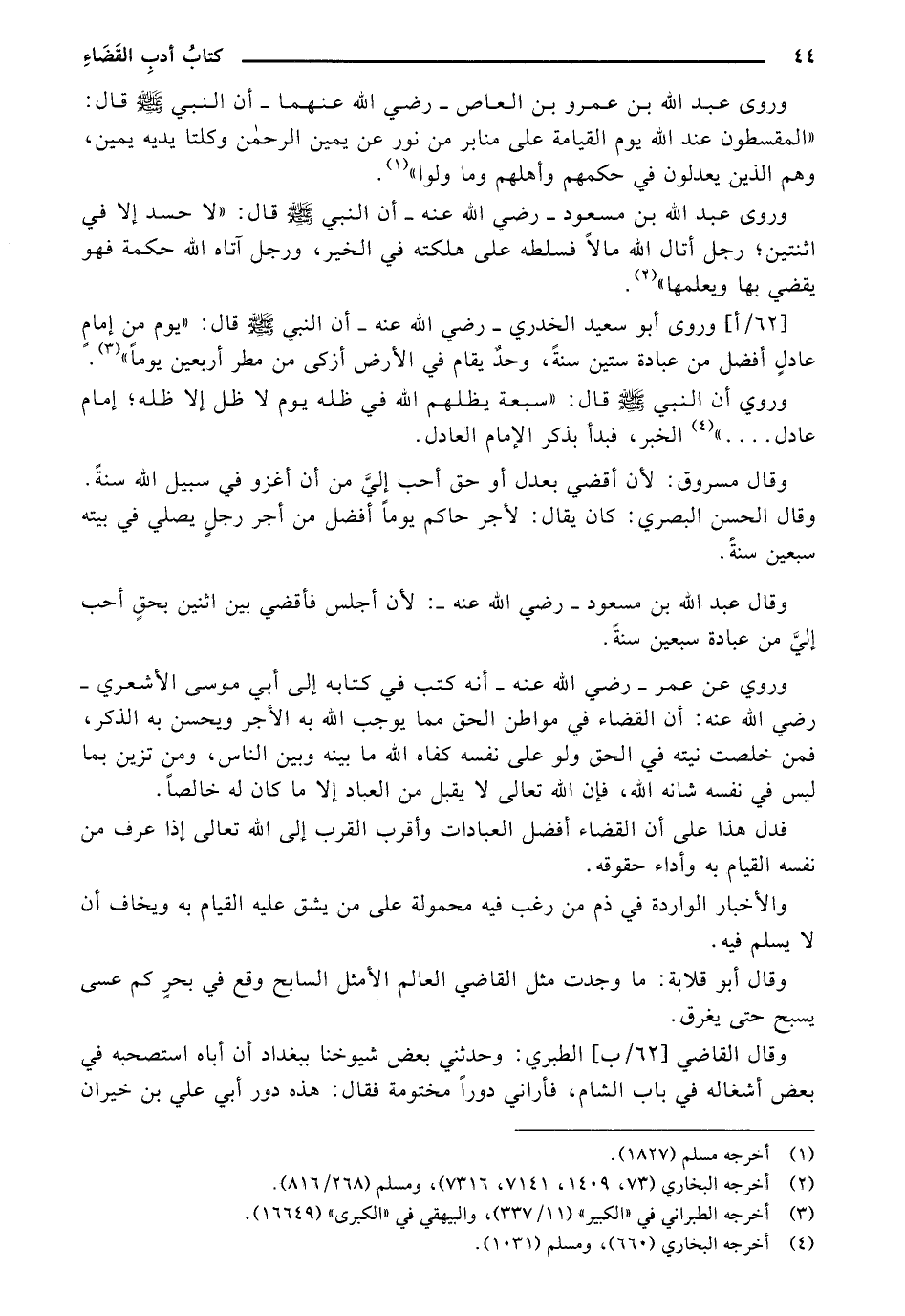 وقال عبد الله بن مسعود- رضي الله عنه -:لأن أجلس فأقضى بين اثنين بحقٍ أحب إلىَّ من عبادة سبعين سنةٌ.