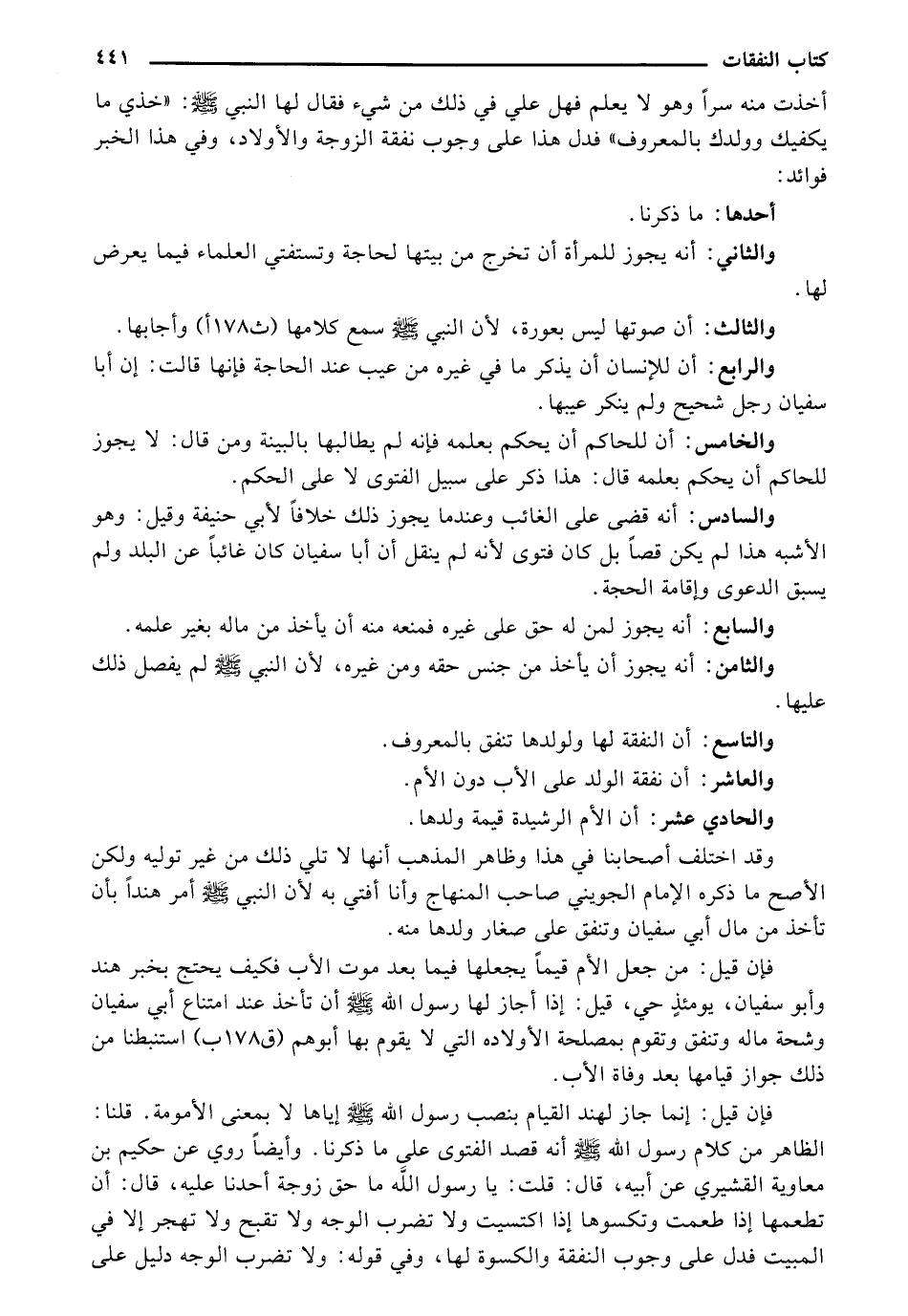 أخذت منه سرًا وهو لا يعلم فهل علي في ذلك من شيء فقال لها النبي صلى الله عليه وسلم: "خذي ما يكفيك وولدك بالمعروف" فدل هذا على وجوب نفقة الزوجة والأولاد، وفي هذا الخبر فوائد: