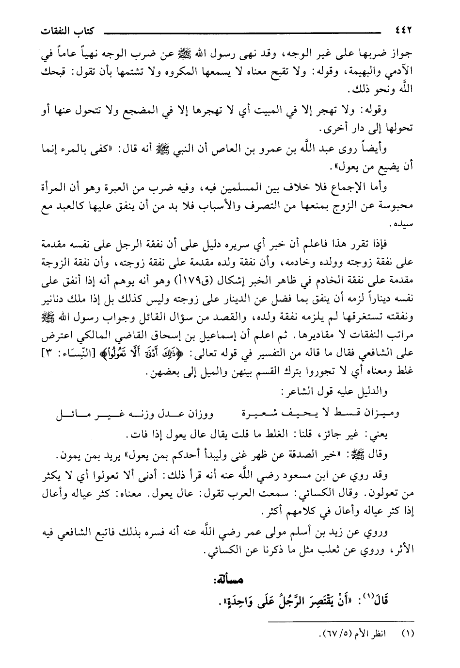 فإذا تقرر هذا فاعلم أن خبر أي سريره دليل على أن نفقة الرجل على نفسه مقدمة على نفقة زوجته وولده وخادمه، وأن نفقة ولده مقدمة على نفقة زوجته، وأن نفقة الزوجة مقدمة على نفقة الخادم في ظاهر الخبر إشكال [ق 179 أ] وهو أن يوهم أنه إذا أنفق على نفسه دينارًا لزمه أن ينفق بما فضل عن الدينار على زوجته وليس كذلك بل إذا ملك دنانير ونفقته تستغرقها لم يلزمه نفقة ولده، والقص من سؤال القائل وجواب رسول الله صلى الله عليه وسلم مراتب النفقات لا مقاديرها. ثم اعلم أن إسماعيل بن إسحاق القاضي المالكي اعترض على الشافعي فقال ما قاله من التفسير في قوله تعالى: {ذَلِكَ أَدْنَى أَلاَّ تَعُولُوا} [النساء: 3] غلط ومعناه أي لا تجوروا بترك القسم بينهن والميل إلى بعضهن.