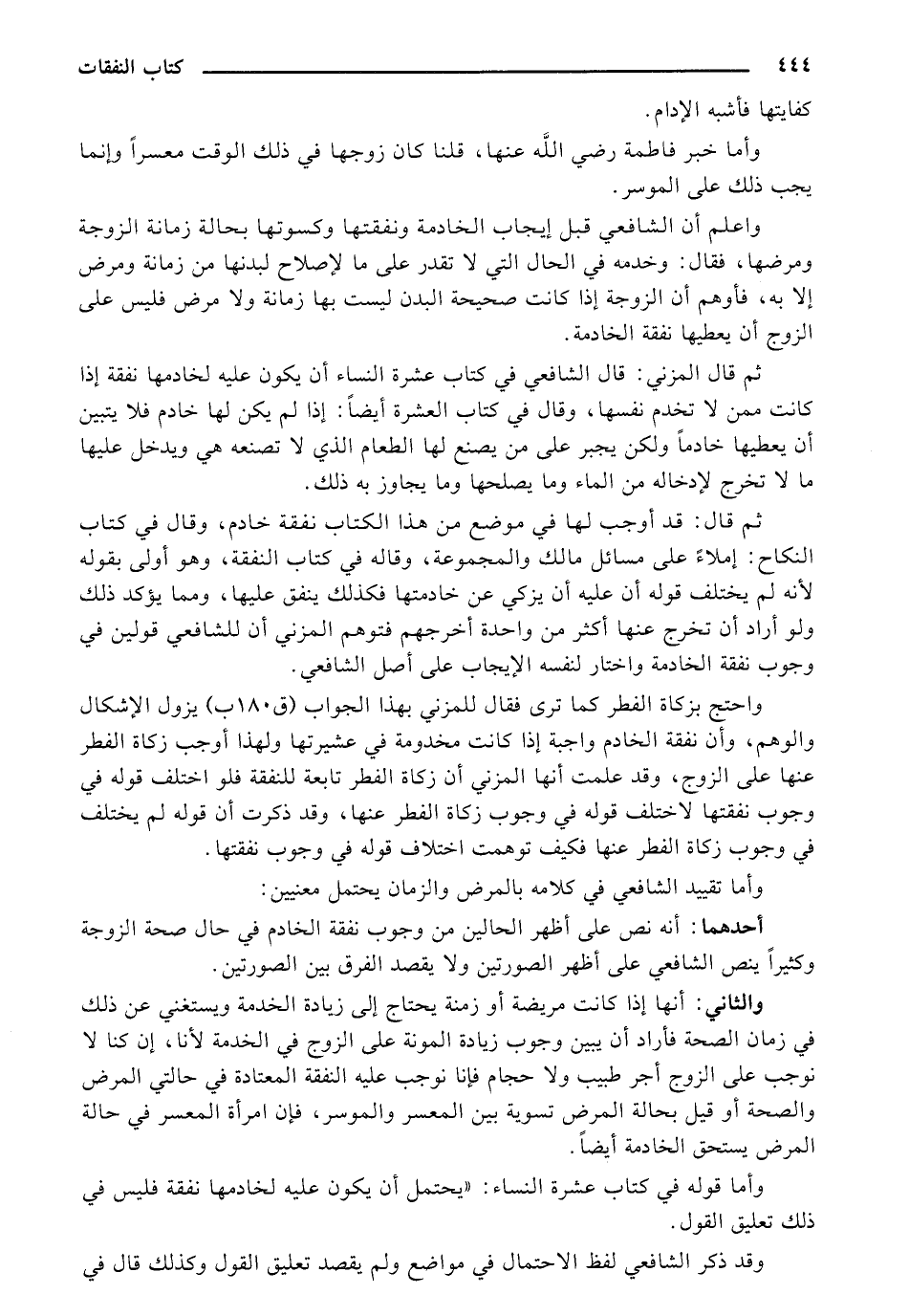 ثم قال: قد أوجب لها في موضع من هذا الكتاب نفقة خادم، وقال في كتاب النكاح: إملاءً على مسائل مالك والمجموعة، وقاله في كتاب النفقة، وهو أولى بقوله لأنه لم يختلف قوله أن عليه أن يزكي عن خادمتها فكذلك ينفق عليها، ومما يؤكد ذلك ولو أراد أن تخرج عنها أكثر من واحدة أخرجهم فتوهم المزني أن للشافعي قولين في وجوب نفقة الخادمة واختار لنفسه الإيجاب على أصل الشافعي.