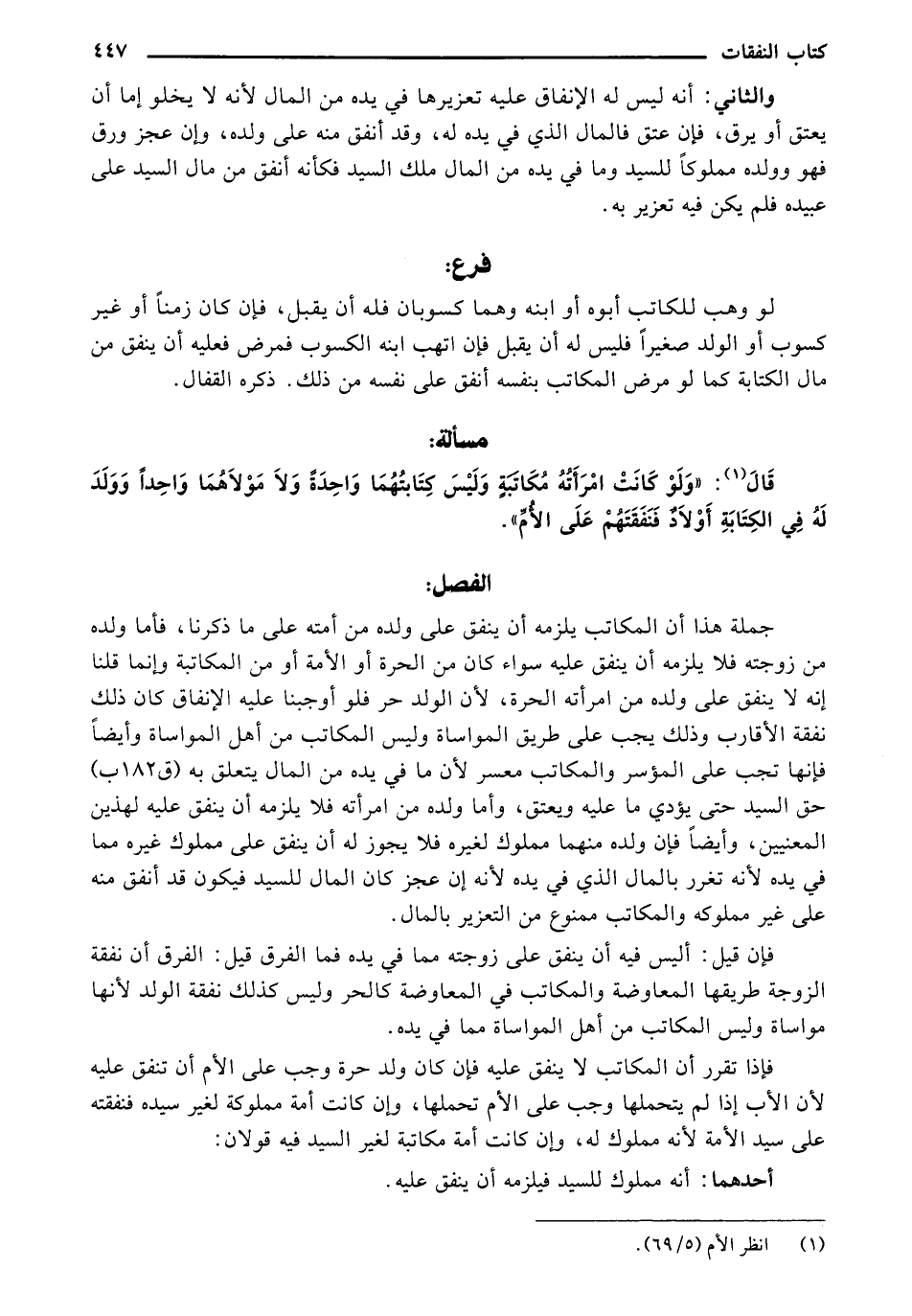 والثاني: أنه ليس له الإنفاق عليه تعزيرها في يده من المال لأنه لا يخلو إما أن يعتق أو يرق، فإن عتق المال الذي في يده له، وقد أنفق منه على ولده، وإن عجز ورق فهو وولده مملوكًا للسيد وما في يده من المال ملك السيد فكأنه أنفق من مال السيد على عبيده فلم يكن فيه تعزي ربه.