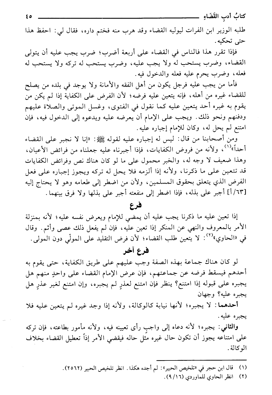 ومن أصحابنا من قال: ليس له إجباره عليه لقول صلى الله عليه وسلم: "إن لا نجبر على القضاء أحداً"؛ ولأنه من فروض الكفايات فإذا أجبرناه عليه جعلناه من فرائض الأعيان؛ وهذا ضعيف لا وجه له؛ والخبر محمول على ما لو كان هناك نص وفرائض الكفايات قد تتعين على ما ذكرنا؛ ولأنه إذا ألزمه فلا يحل له تركه ويجوز إجباره على فعل الفرض الذي يتعلق بحقوق المسلمين؛ ولأن من اضطر إلى طعامه وهو لا يحتاج إليه [63/ أ] أجبر على بذله؛ فإذا اضطر إلى منفعته أجبر على بذلها ولا فرق بينهما.