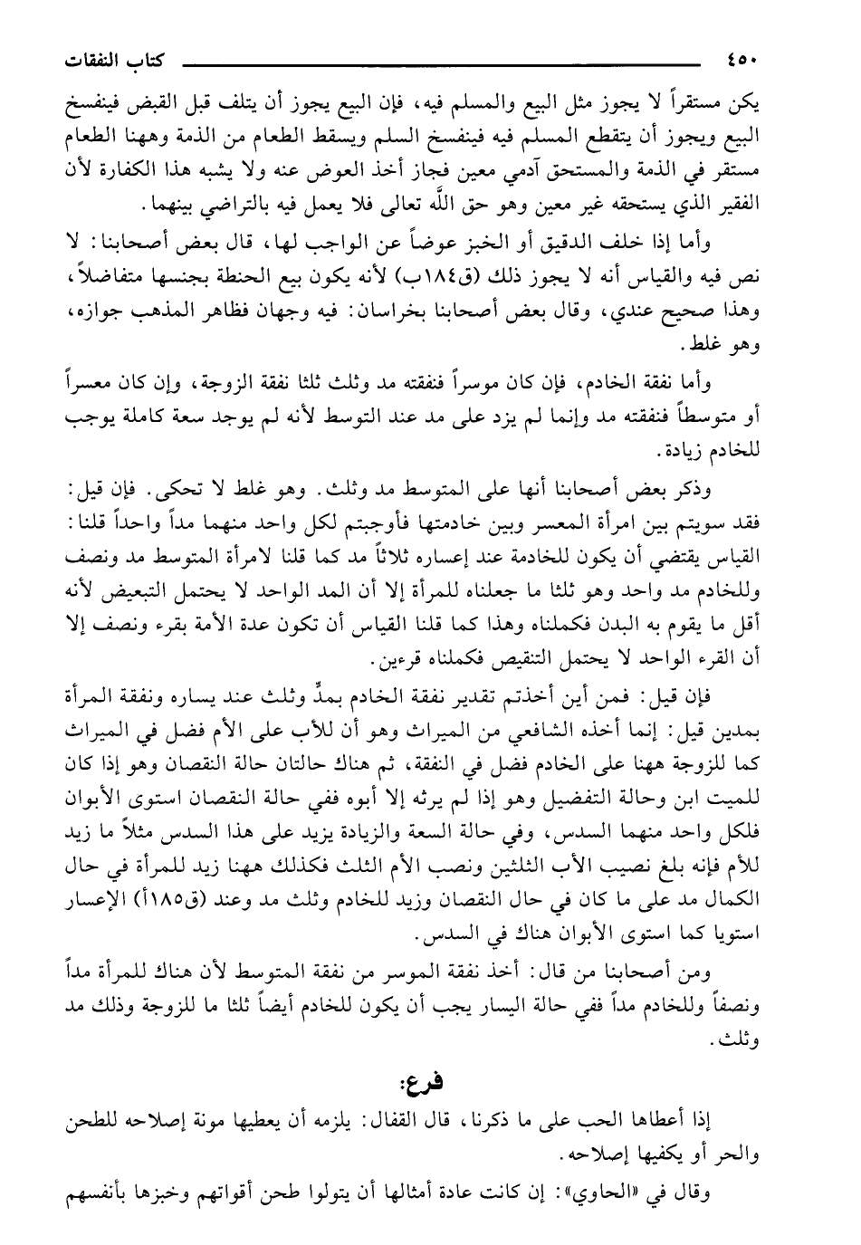 وذكر بعض أصحابنا أنها على المتوسط مد وثلث. وهو غلط لا تحكى. فإن قيل: فقد سويتم بين امرأة المعسر وبين خادمتها فأوجبتم لكل واحد منهما مدًا واحدًا قلنا: القياس يقتضي أن يكون للخادمة عند إعساره ثلاثًا مد كما قلنا لامرأة المتوسط مد ونصف وللخادم مد واحد وهو ثلثا ما جعلناه للمرأة إلا أن المد الواحد لا يحتمل التبعيض لأنه أقل ما يقوم به البدن فكلمناه وهذا كما قلنا القياس أن تكون عدة الأمة بقرء ونصف إلا أن القرء الواحد لا يحتمل التنقيص فكملناه قرءين.