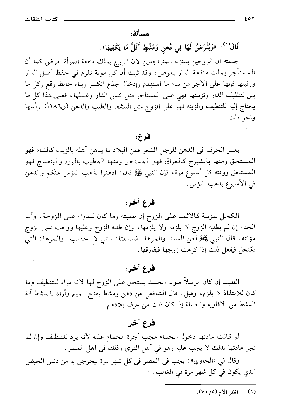 جملته أن الزوجين بمنزلة المتواجدين لأن الزوج يملك الزوج منفعة المرأة بعوض كما أن المستأجر يملك منفعة الدار بعوض، وقد ثبت أن كل مونة تلزم في حفظ أصل الدار ورقبتها فإنها علي الأجر من بناء ما استهدم وإدخال جذع انكسر وبناء حائط وقع وكل ما يحتاج إليه التنظيف الدار وتزينها فهي علي المستأجر مثل كنس الدار وغسلها، فعلي هذا كل ما يحتاج إليه للتنظيف والزينة فهو علي الزوج مثل المشط والطييب والدهن [ق 186 أ] لرأسها ونحو ذلك.