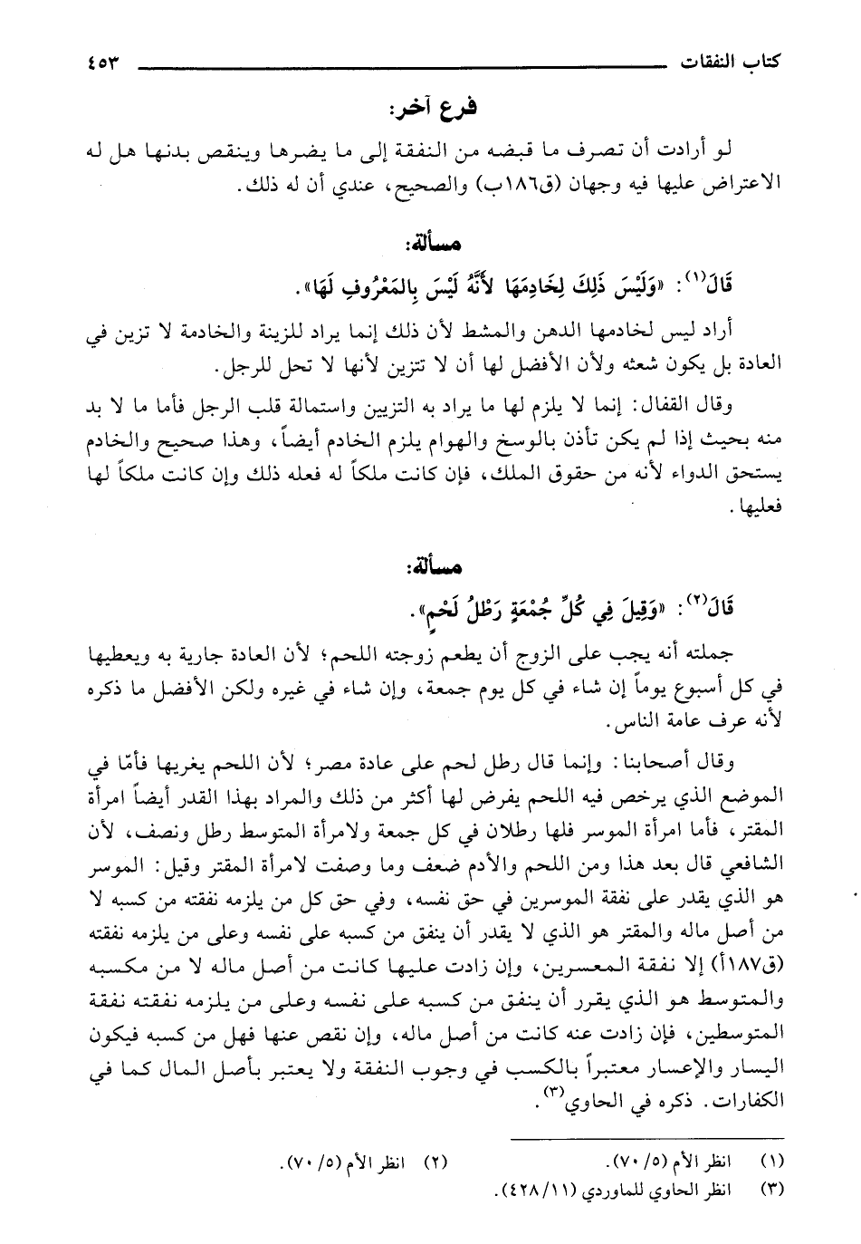 وقال أصحابنا: وإنما قال رطل لحم علي عادة مصر؛ لأن اللحم يغريها فأمّا في الموضوع الذي يرخص فيه اللحم يفرض لها أكثر من ذلك والمراد بهذا القدر أيضاً امرأة المقتر، فأما امرأة الموسر فلها رطلان في كل جمعة ولا مرأة المتوسط رطل ونصف، لأن الشافعي قال بعد هذا ومن اللحم والأدم ضعف وما وصفت لامرأة المقتر وقيل: الموسر هو الذي يقدر علي نفقة الموسرين في حق نفسه، وفي حق كل من يلزمه نفقته من كسبه لا من أصل ماله المقتر هو الذي لا يقدر أن ينفق من كسبه علي نفسه وعلي من يلزمه نفقته [ق 187 أ] إلا نفقة المعسرين، وإن زادت عليها كانت من أصل ماله لا من مكسبه والمتوسط هو الذي يقرر أ، ينفق من كسبه علي نفسه وعلي من يلزمه نفقته نفقة المتوسطين، فإن زادت عنه كانت من أصل ماله، وإن نقص عنها من كسبه فيكون اليسار والإعسار معتبراً بالكسب في وجوب النفقة ولا يعتبر بأصل المال كما في الكفارات. [ذكره] في الحاوي.