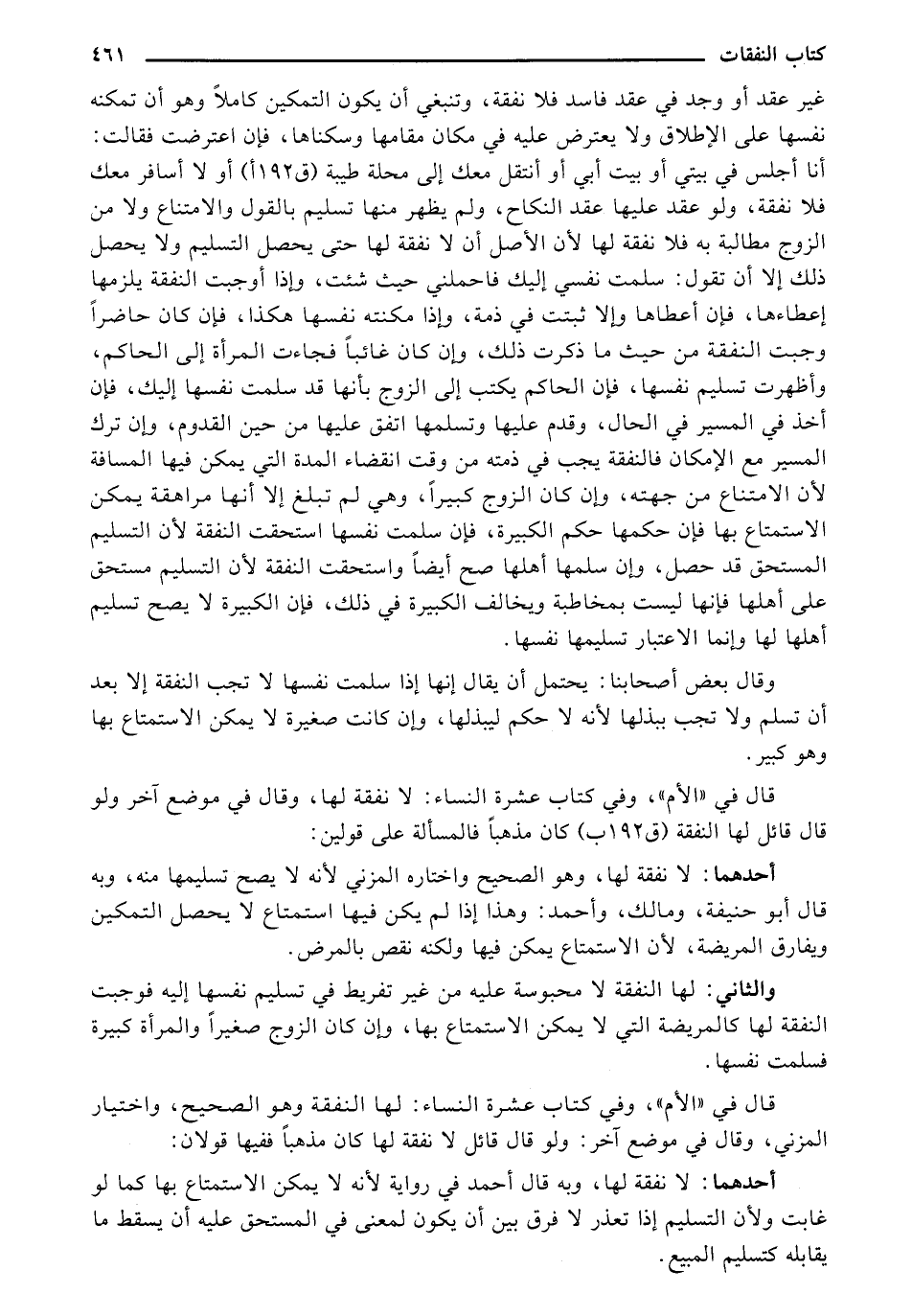 غير عقد أو وجد في عقد فاسد فلا نفقة، وتنبغي أن يكون التمكين كاملاً وهو أن تمكنه نفسها علي الإطلاق ولا يعترض في مكان مقامها وسكناها، فإن اعترضت فقالت: أنا أجلس في بيتي أو بيت أبي أو أنتقل معك إلي محلة طيبة [ق 192 أ] أو لا أسافر معك فلا نفقة، ولو عقد عليها عقد النكاح، ولم يظهر منها تسليم بالقول والامتناع ولا من الزوج مطالبة به فلا نفقة لها لأن الأصل أن لا نفقة لها حتى يحصل التسليم ولا يحصل ذلك إلا أن تقول: سلمت نفسي إليك فاحملني حيث شئت، وإذا أوجبت النفقة يلزمها إعطاءها، فإن أعطاها وإلا ثبتت في ذمة، وإذا مكنته نفسها هكذا، فإن كان حاضراً وجبت النفقة من حيث ما ذكرت، وإن كان غائباً فجاءت المرأة إلي الحاكم، وأظهرت تسليم نفسها، فإن الحاكم يكتب إلي الزوج بأنها قد سلمت نفسها إليك، فإن أخذ في المسير في الحال، وقدم عليها وتسلمها اتفق عليها من حين القدوم، وإن ترك المسير مع الإمكان فالنفقة يجب في ذمته من وقت انقضاء المدة التي يمكن فيها المسافة لأن الامتناع من جهته، وإن كان الزوج كبيراً، وهي لم تبلغ إلا أنها مراهقة يمكن الاستمتاع بها فإن حكمها حكم الكبيرة، فإن سلمت نفسها استحقت النفقة لأن التسليم المستحق قد حصل، وإن سلمها أهلها صح أيضاً واستحقت النفقة لأن التسليم مستحق علي أهلها فأنها ليست بمخاطبة ويخالف الكبيرة في ذلك، فإن الكبيرة لا يصح تسليم أهلها لها وإنما الاعتبار تسليمها نفسها.