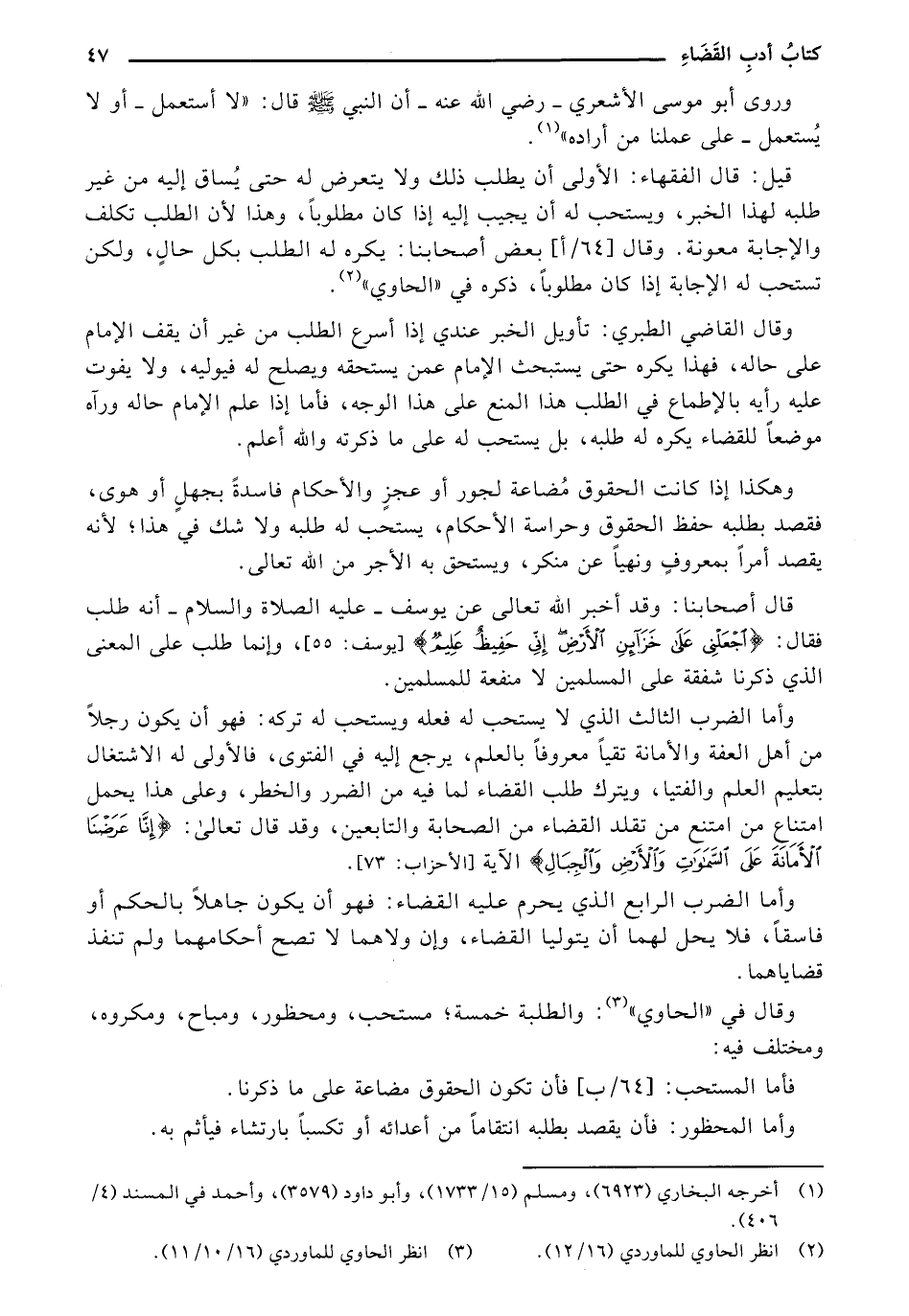 وأما الضرب الثالث الذي لا يستحب له فعله ويستحب له تركه: فهو أن يكون رجلاً من أهل العفة والأمانة تقياً معروفاً بالعلم؛ يرجع إليه في الفتوى؛ فالأولى له الاشتغال بتعليم العلم والفتيا؛ ويترك طلب القضاء لما فيه من الضرر والخطر؛ وعلى هذا يحمل امتناع من امتنع من تقلد القضاء من الصحابة والتابعين؛ وقد قال تعالى: {إنَّا عَرَضْنَا الأَمَانَةَ عَلَى السَّمَوَاتِ والأَرْضِ والْجِبَالِ} الآية [الأحزاب:73].