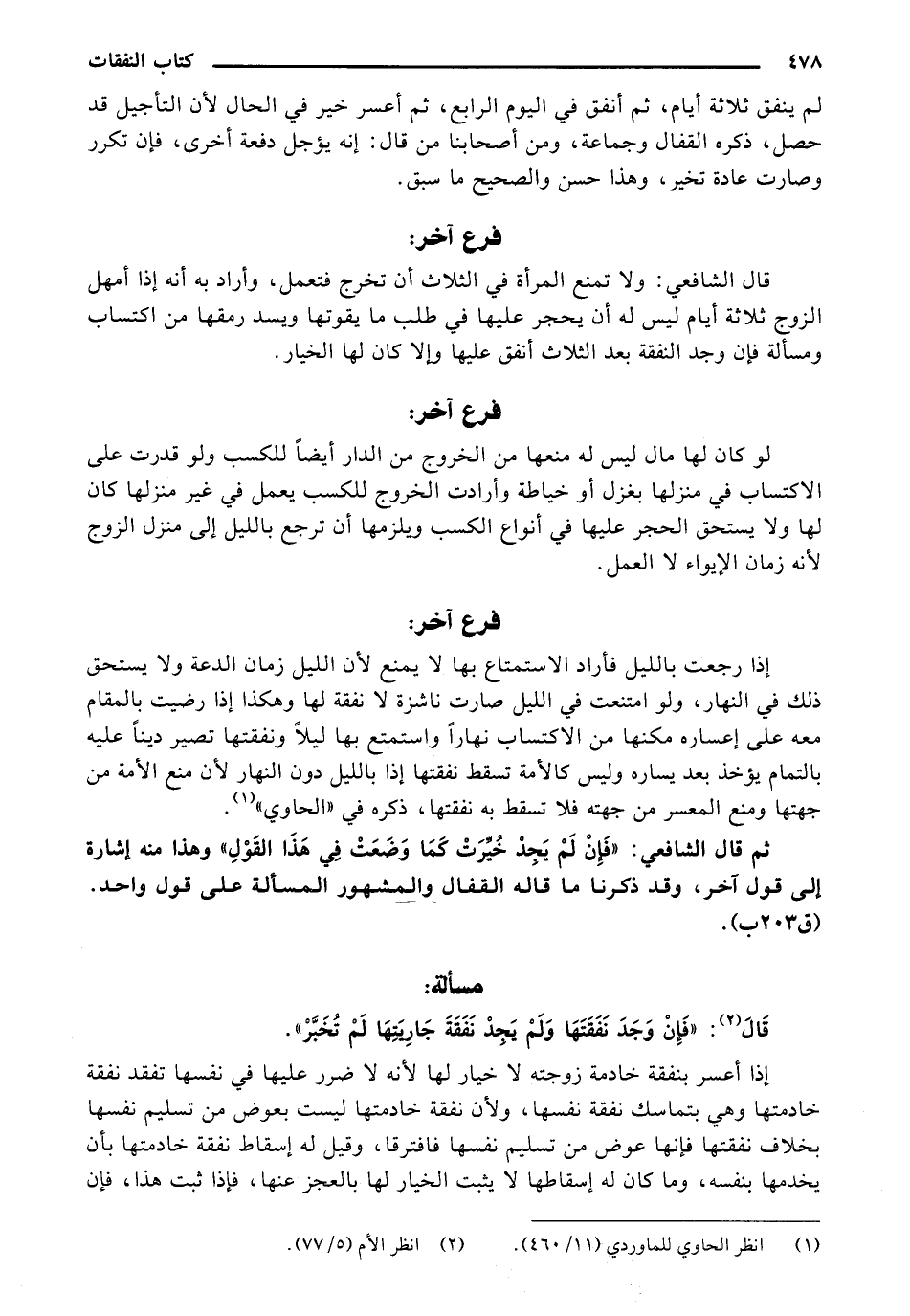 إذا أعسر بنفقة خادمة زوجته لا خيار لها لأنه لا ضرر عليها في نفسها تفقد نفقة خادمتها وهي بتماسك نفقة نفسها، ولأن نفقة خادمتها ليست بعوض من تسليم نفسها بخلاف نفقتها فإنها عوض من تسليم نفسها فافترقا، وقيل له إسقاط نفقة خادمتها بأن يخدمها بنفسه، وما كان له إسقاطها لا يثبت الخيار لها بالعجز عنها، فإذا ثبت هذا، فإن
