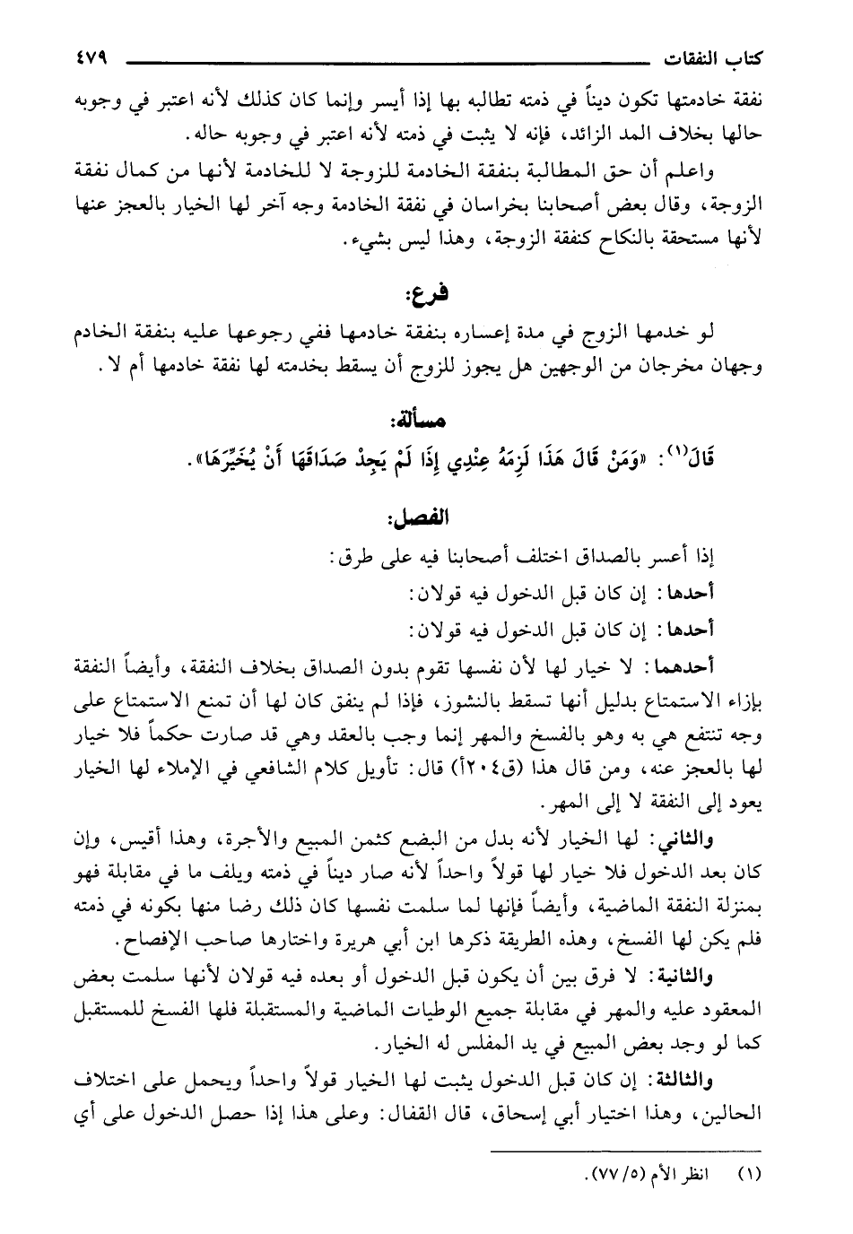 واعلم أن حق المطالبة بنفقة الخادمة للزوجة لا للخادمة لأنها من كمال نفقة الزوجة، وقال بعض أصحابنا بخراسان في نفقة الخادمة وجه آخر لها الخيار بالعجز عنها لأنها مستحقة بالنكاح كنفقة الزوجة، وهذا ليس بشيء.
