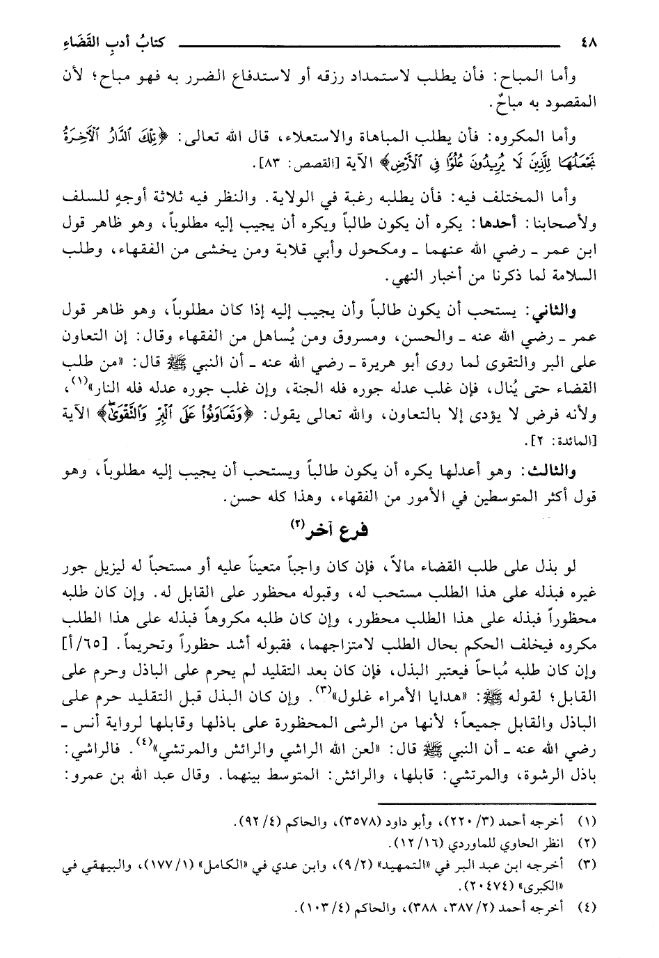 والثاني: يستحب أن يكون طالباً وأن يجيب إليه إذا كان مطلوباً؛ وهو ظاهر قول عمر - رضي الله عنه - والحسن؛ ومسروق ومن يُساهل من الفقهاء وقال: إن التعاون على البر والتقوى لما روى أبو هريرة - رضي الله عنه - أن النبي صلى الله عليه وسلم قال: "من طلب القضاء حتى يُنال؛ فإن غلب عدله جوره فله الجنة؛ وإن غلب جوره عدله فله النار"؛ ولأنه فرض لا يؤدى بالتعاون؛ والله تعالى يقول: {وتَعَاوَنُوا عَلَى البِرِّ والتَّقْوَى} الآية [المائدة: 2].