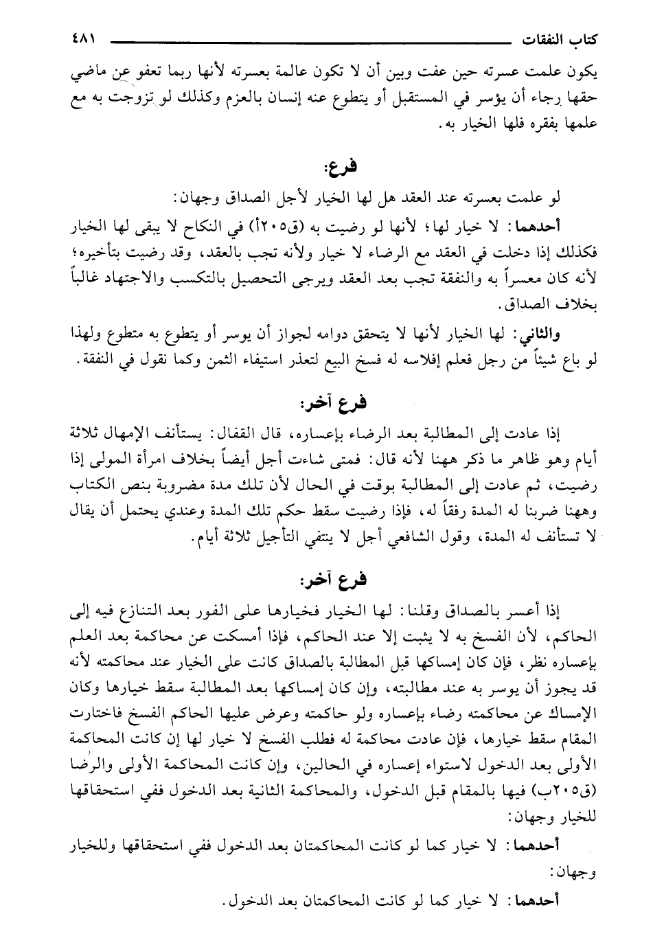 إذا أعسر بالصداق وقلنا: لها الخيار فخيارها على الفور بعد التنازع فيه إلى الحاكم، لأن الفسخ به لا يثبت إلا عند الحاكم، فإذا أمسكت عن محاكمة بعد العلم بإعساره نظر، فإن كان إمساكها قبل المطالبة بالصداق كانت على الخيار عند محاكمته لأنه قد يجوز أن يوسر به عند مطالبته، وإن كان إمساكها بعد المطالبة سقط خيارها وكان الإمساك عن محاكمته رضاء بإعساره ولو حاكمته وعرض عليها الحاكم الفسخ فاختارت المقام سقط خيارها، فإن عادت محاكمة له فطلب الفسخ لا خيار لها إن كانت المحاكمة الأولى بعد الدخول لاستواء إعساره في الحالين، وإن كانت المحاكمة الأولى والرضا [ق 205 ب] فيها بالمقام قبل الدخول، والمحاكمة الثانية بعد الدخول ففي استحقاقها للخيار وجهان:
