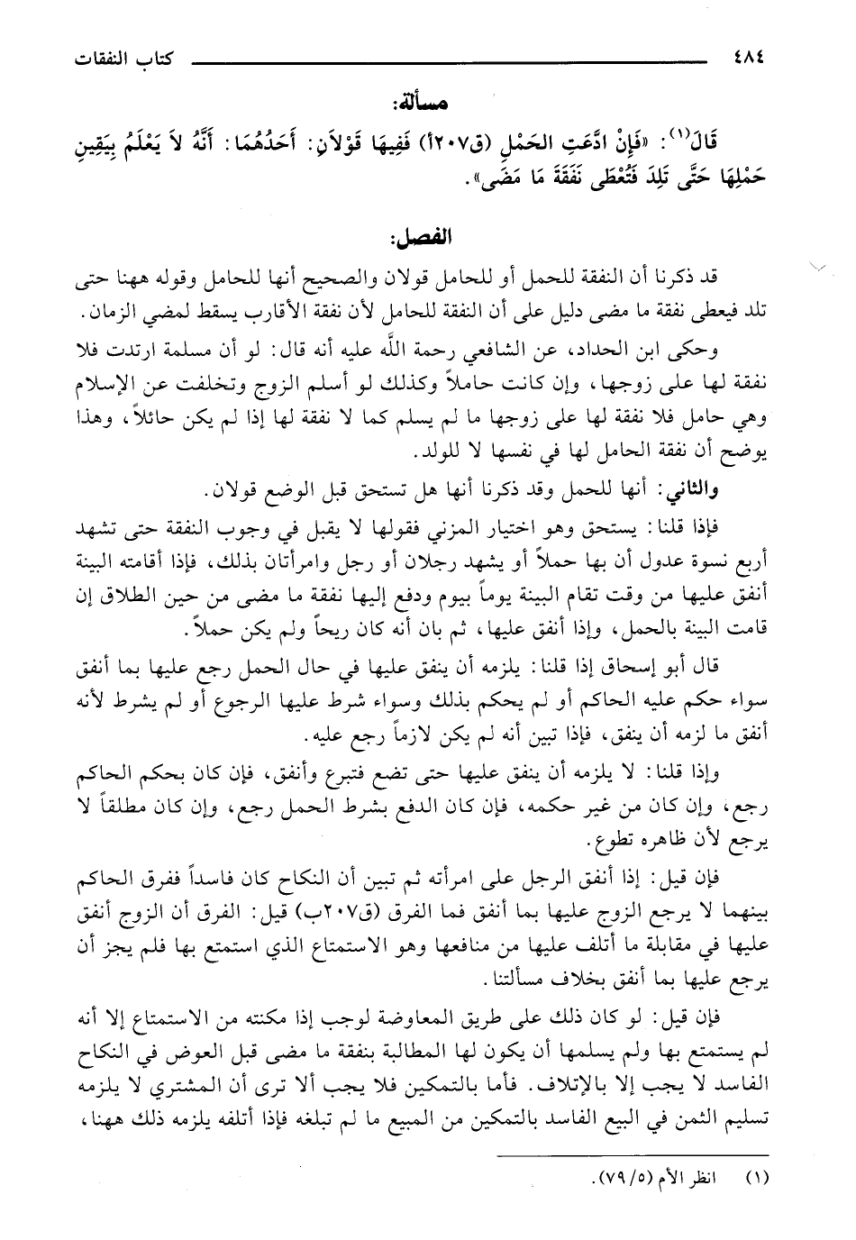 قَالَ: "فَإِنْ ادَّعَتِ الحَمْلِ [ق 207 أ] فَفِيهَا قَوْلَانِ: أحدهما: أَنَّهُ لَا يَعْلَمُ بِيَقِينِ حَمْلِهَا حَتَّى تَلِدَ فَتُعْطَى نَفَقَةَ مَا مَضَى".