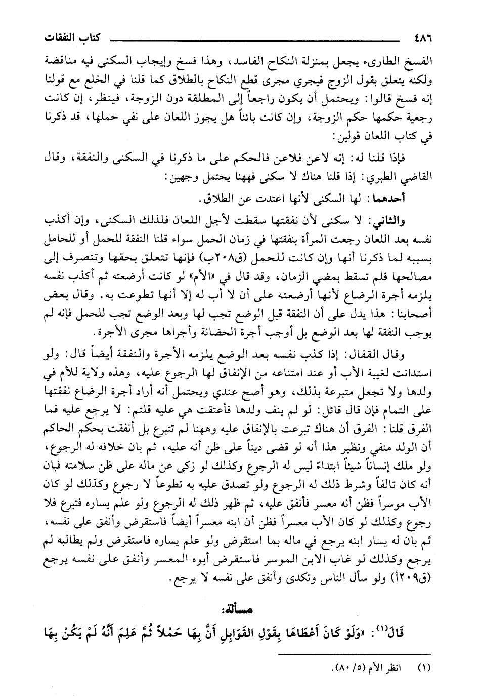 الفسخ الطارئ يجعل بمنزلة النكاح الفاسد، وهذا فسخ وإيجاب السكنى فيه مناقضة ولكنه يتعلق بقول الزوج فيجري مجرى قطع النكاح بالطلاق كمل قلنا في الخلع مع قولنا إنه فسخ قالوا: ويحتمل أن يكون راجعًا إلى المطلقة دون الزوجة، فينظر، إن كانت رجعية حكمها حكم الزوجة، وإن كانت بائنًا هل يجوز اللعان على نفي حملها، قد ذكرنا في كتاب اللعان قولين: