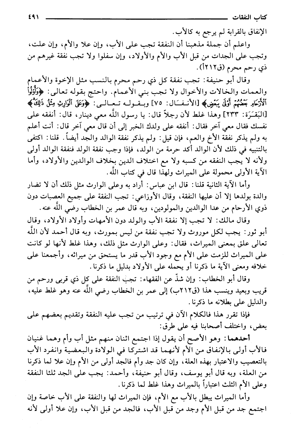 واعلم أن جملة مذهبنا أن النفقة تجب على الأب، وإن علا والأم، وإن علت، وتجب على الجدات من قبل الأب والأم والأولاد، إن سلفوا ولا تجب نفقة غيرهم من ذي رحم مرحوم [ق 212 أ].
