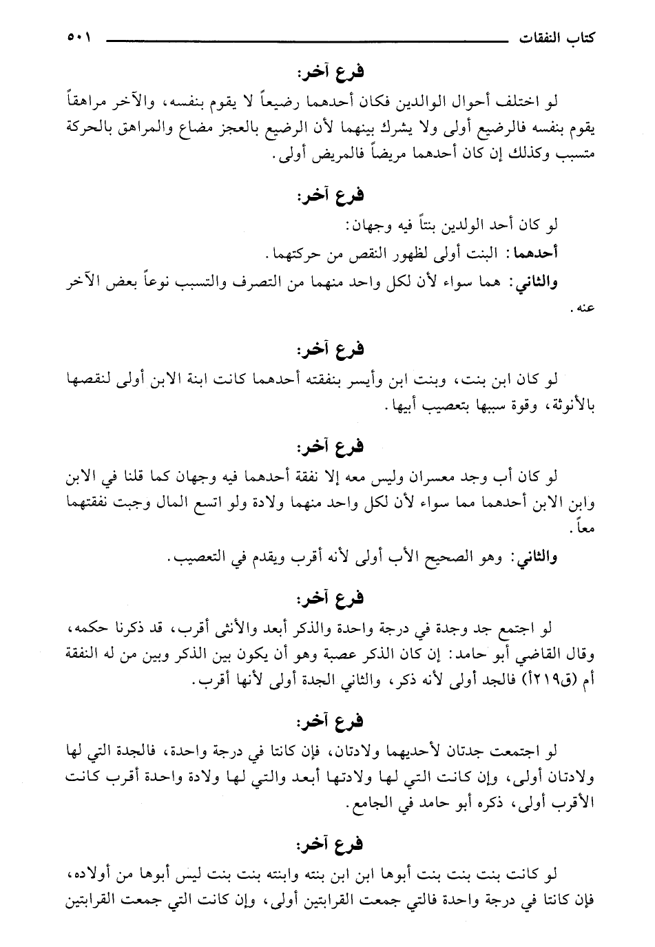 لو كان ابن بنت، وبنت ابن وأيسر بنفقته أحدهما كانت ابنة الابن أولى لتقصها بالأنوثة، وقوة سببها بتعصيب أبيها.