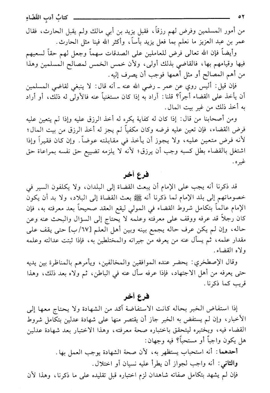 فإن قيل: أليس وروي عن عمر- رضي الله عنه- أنه قال: لا ينبغي لقاضي المسلمين أن يأخذ علي القضاء أجراً؟ قلنا: أراد به إذا كان مستغنياً عنه فالأولي له ذلك، أو أراد به أخذ ذلك من غير بيت المال.