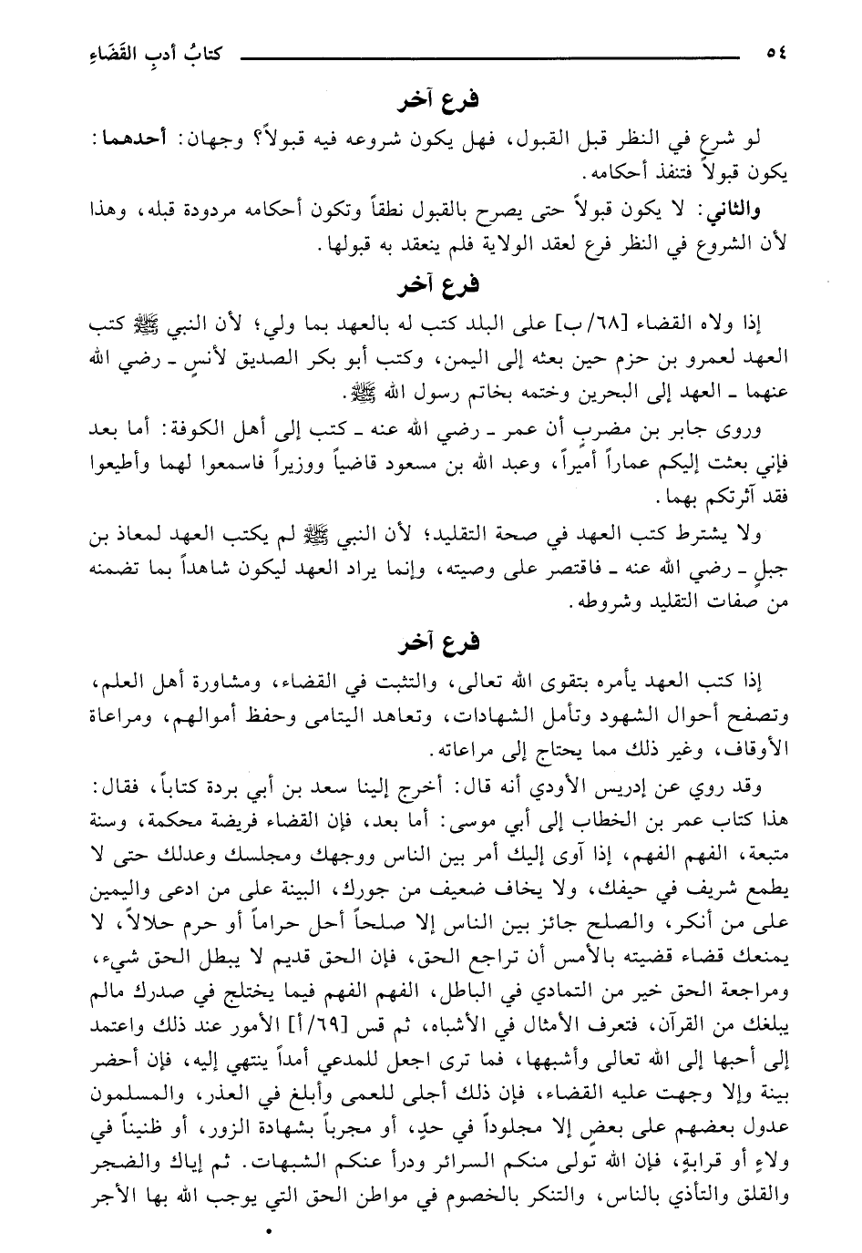 وقد روي عن إدريس الآوي أنه قال: أخرج إلينا سعد بن أبي بردة كتاباً، فقال: هذا كتاب عمر بن الخطاب إلي أبي موسي: أما بعد، فإن القضاء فريضة محكمة، وسنة متبعة، الفهم الفهم، إذا آوى إليك أمر بين الناس ووجهك ومجلسك وعدلك حتى لا يطمع شريف في حيفك، ولا يخاف ضعيف من جورك، البينة علي من ادعي واليمن علي من أنكر، والصلح جائز بين الناس إلا صلحاً أحل حراماً أو حرم حلالاً، لا يمنعك من قضاء قضيته بالأمس أن تراجع الحق، فإن الحق قديم لا يبطل الحق شيء، ومراجعة الحق خير من التمادي في لباطل، الفهم فيما يختلج في صدرك ما لم يبلغك من القرآن، فتعرف الأمثال في الأشباه، ثم قس [69/ أ] الأمور عند ذلك واعتمد إلي أحبها إلي الله تعالي وأشبها، فما تري اجعل للمدعي أمداً ينتهي إليه، فإن أحضر بينة وإلا وجهت عليه القضاء، فإن ذلك أجلي للعمى وأبلغ في العذر، والمسلمون عدول بعضهم علي بعض إلا مجلوداً في حدٍ، أو مجرباً بشهادة الزور، أو ظنيناً في ولاء أو قرابة، فإن الله تولي منكم السرائر ودرأ عنكم الشبهات. ثم إياك والضجر والقلق والتأذي بالناس، والتنكر بالخصوم في مواطن الحق التي يوجب الله بها الأجر