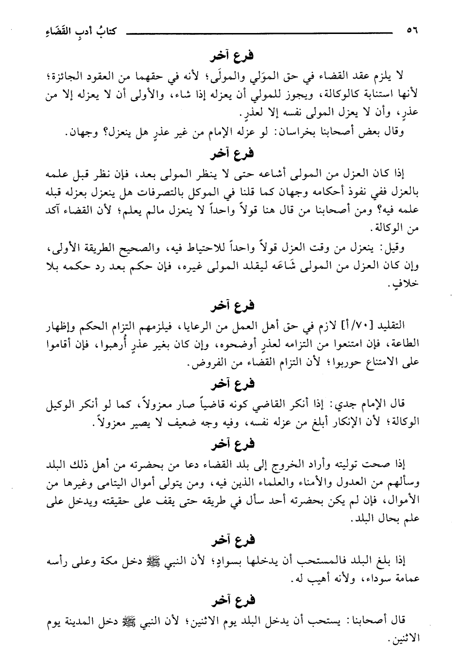 لا يلزم عقد القضاء في حق المولي والمولي؛ لأنه في حقهما من العقود الجائزة؛ لأنها استنابة كالوكالة، ويجوز للمولي أن يعزله إذا شاء، والأولي أن لا يعزله إلا من عذرٍ، وأن لا يعزله المولي نفسه إلا لعذرٍ.