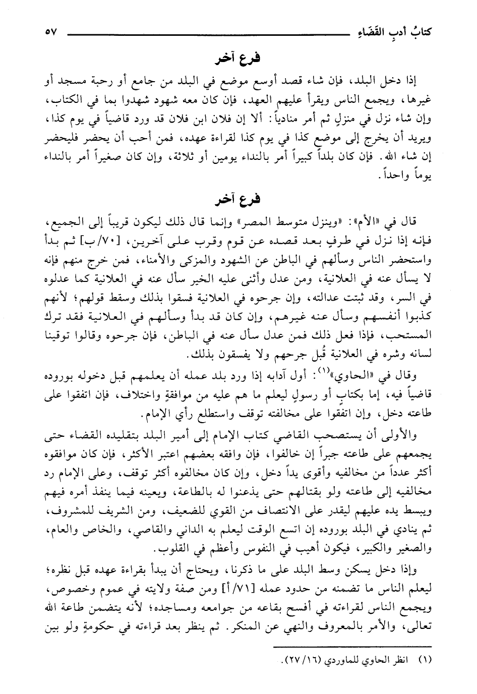 والأولي أن يستصحب القاضي كتاب الإمام إلي أمير البلد بتقليده القضاء حتى يجمعهم علي طاعته جبراً إن خالفوا، فإن وافقه بعضهم اعتبر الأكثر، فإن كان موافقوه أكثر عدداً من مخالفيه وأقوي يداً دخل، وإن كان مخالفوه أكثر توقف، وعلي الإمام رد مخالفيه إلي طاعته ولو بقتالهم حتى يذعنوا له بالطاعة، ويعنيه فيما ينفذ أمره فيهم ويبسط عليهم ليقدر علي الانتصاف ن القوي للضعيف، ومن الشريف للمشروف، ثم ينادي في البلد بوردة إن اتسع الوقت ليعلم به الداني والقاصي، والخاص والعام، والصغير والكبير، فيكون أهيب في النفوس وأعظم في القلوب.