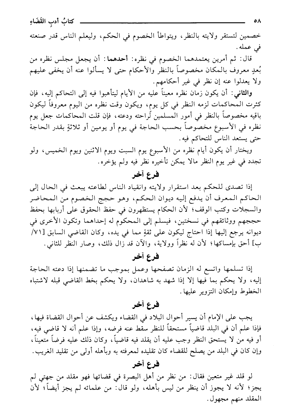 قال: ثم أمرين يعتمدهما الخصوم في نظره: أحدهما: أن يجعل مجلس نظره من بُعٍد معروف بالمكان مخصوصاً بالنظر والأحكام حتى لا يسألوا عنه أن يخفى عليهم ولا يعدلوا عنه إن نظر في غير أحكامهم.