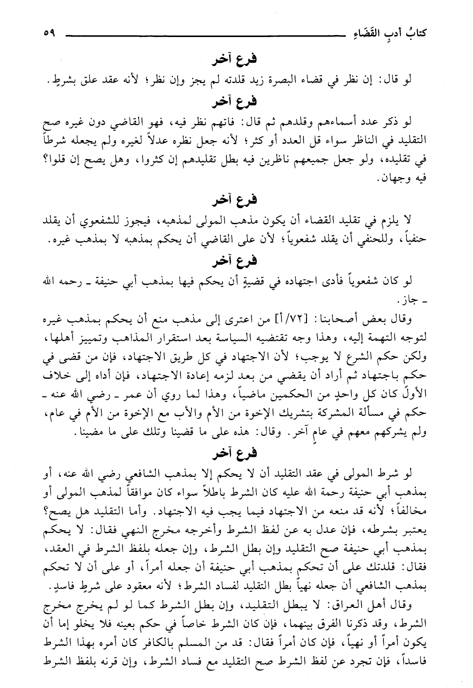 لو شرط المولي في عقد التقليد أن لا يحكم إلا بمذهب الشافعي رضي الله عنه، أو بمذهب أبي حنيفة رحمة الله عليه كان الشرط باطلاً سواء كان موافقاً لمذهب المولي أو مخالفاً؛ لأنه قد منعه من الاجتهاد فيما يجب الاجتهاد. وأما التقليد هل يصح؟ يعتبر بشرطه، فإن عدل به عن لفظ الشرط وأخرجه مخرج النهي فقال: لا يحكم بمذهب أبي حنيفة صح التقليد وإن بطل الشرط، وإن جعله بلفظ الشرط في العقد، فقال: قلدتك علي أن تحكم بمذهب أبي حنيفة أن جعله أمراً، أو أن لا تحكم بمذهب الشافعي أن جعله نهياً بطل التقليد لفساد الشرط؛ لأنه معقود علي شريطٍ فاسدٍ. وقال أهل العراق: لا يبطل التقليد، وإن بطل الشرط كما لو لم يخرج مخرج الشرط، وقد ذكرنا الفرق بينهما، فإن كان الشرط خاصاً في حكم بعينه فلا يخلو إما أن يكون أمراً أو نهياً، فإن كان أمراً فقد: قد من السلم بالكافر كان أمره بهذا الشرط فاسداً، فإن تجرد عن لفظ الشرط صح التقليد مع فساد الشرط، وإن قرنه بلفظ الشرط صح التقليد مع فساد الشرط، وإن قرنه بلفظ الشرط