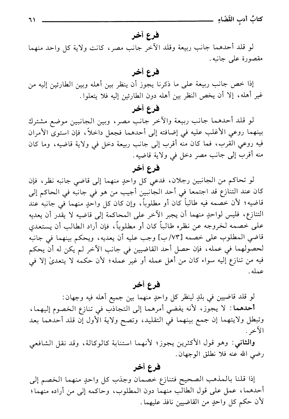 لو قلد أحدهما جانب ربيعة وقلد الآخر جانب مصر، كانت ولاية كل واحد منهما مقصورة علي جانبه.