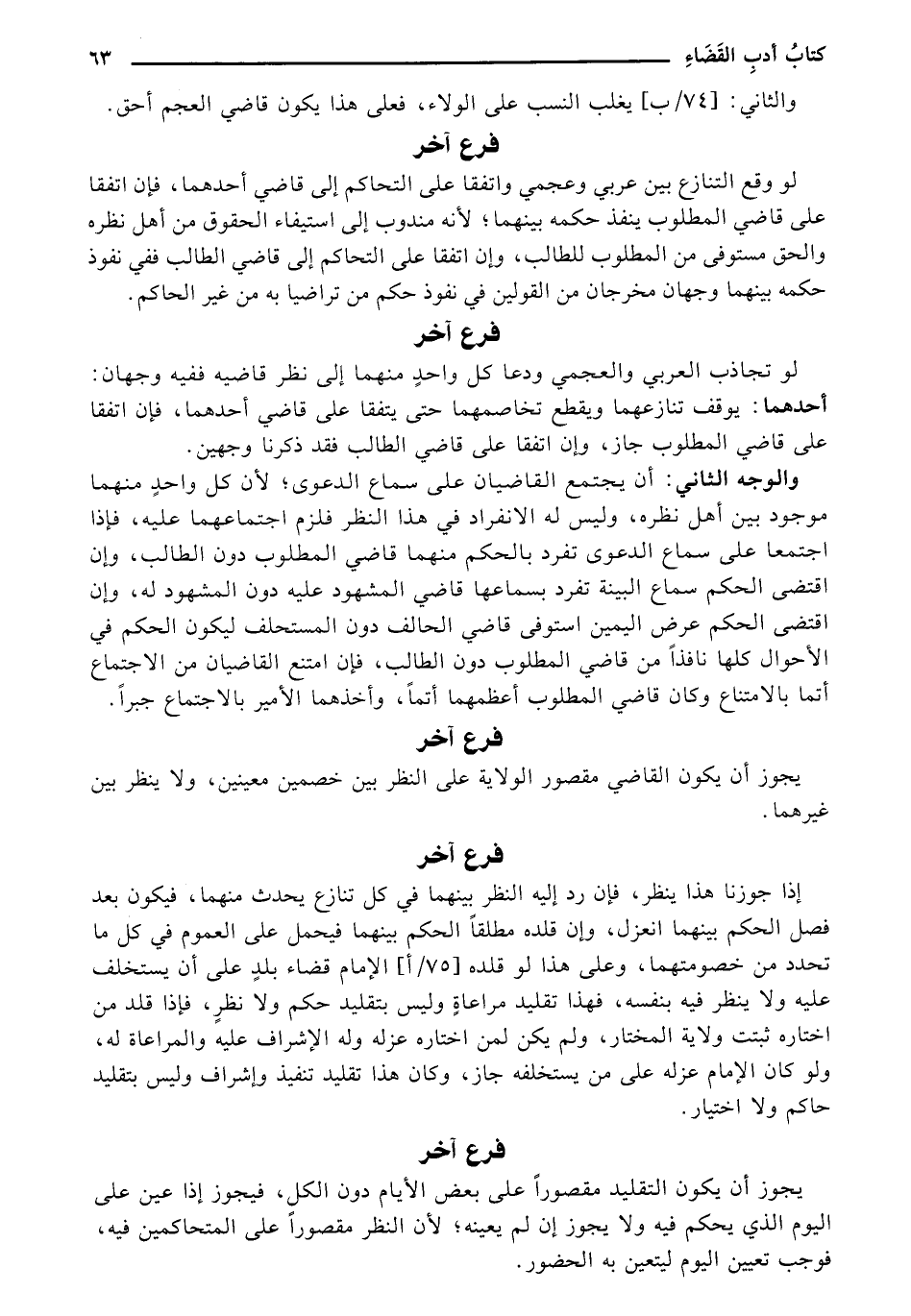 لو تجاذب العربي والعجمي ودعا كل واحدٍ منهما إلي نظر قاضيه ففيه وجهان: أحدهما: يوقف تنازعهما ويقطع تخاصمهما حتى يتفقا علي قاضي أحدهما، فإن اتفقا علي قاضي المطلوب جاز، وأن اتفقا علي قاضي الطالب فقد ذكرنا وجهين.