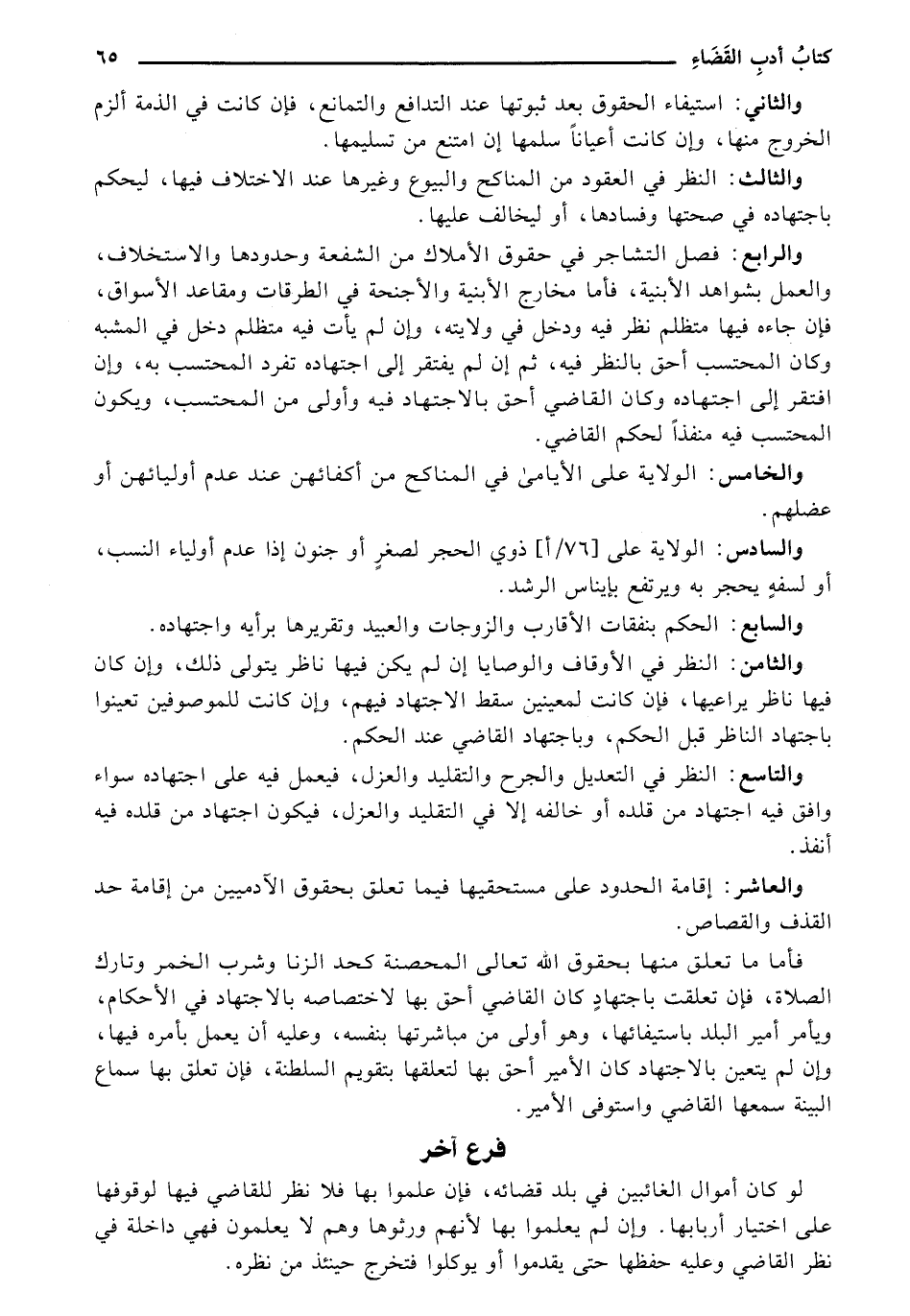 والعاشر: إقامة الحدود علي مستحقيها فيما تعلق بحقوق الآدميين من إقامة حد القذف والقصاص.