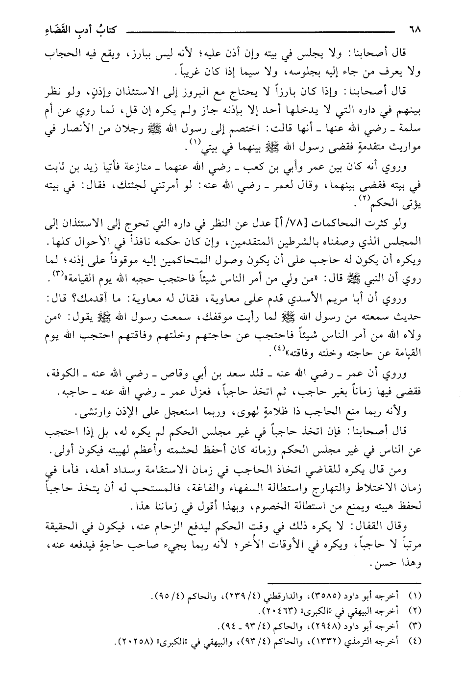 وروي أن عمر -رضي الله عنه - قلد سعد بن أبي وقاص - رضي الله عنه- الكوفة، فقضي فيها زماناً بغير حاجب، ثم اتخذ حاجباً، فعزل عمر- رضي الله عنه- حاجبه. ولأنه ربما منع الحاجب ذا ظلامةٍ لهوى، وربما استعجل على الإذن وارتشى.