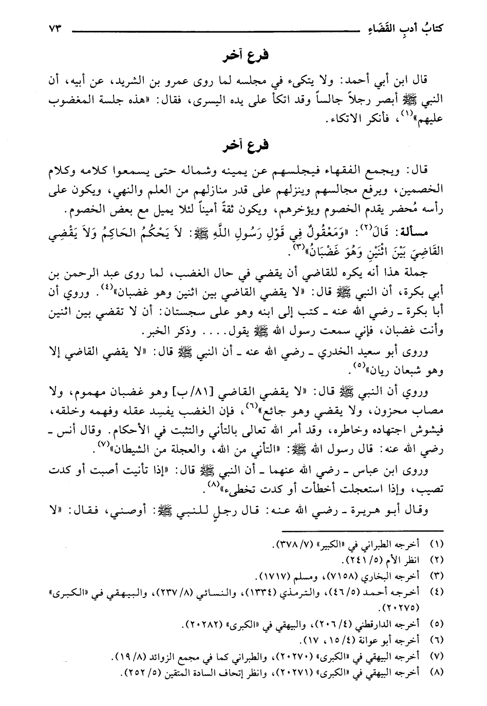 مسألة: قَالَ: "وَمَعْقُولٌ فِي قَوْلِ رَسُولِ اللهِ صلى الله عليه وسلم: لَا يَحْكُمُ الحَاكِمُ وَلَا يَقْضِي القَاضِيَ بَيْنَ اثْنَيْنِ وَهُوَ غَضْبَانُ".