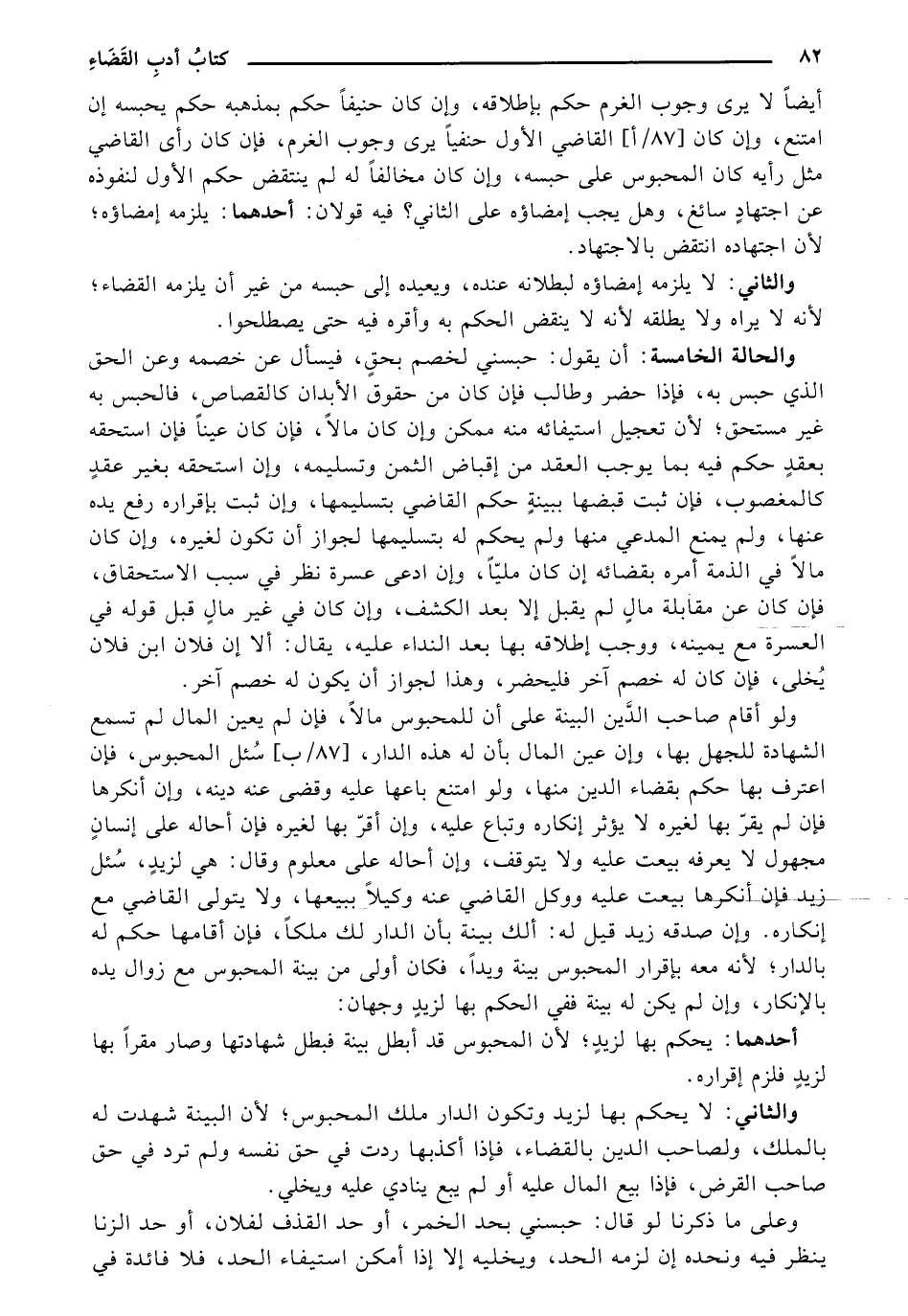 أيضًا لا يرى وجوب الغرم حكم بإطلاقه، وإن كان حنيفًا حكم بمذهبه حكم يحبسه إن امتنع، وإن كان [87/ أ] القاضي الأول حنفيًا يرى وجوب الغرم، فإن كان رأى القاضي مثل رأيه كان المحبوس على حبسه، وإن كان مخالفًا له لم ينتقض حكم الأول لنفوذه عن اجتهادٍ سائغ، وهل يجب إمضاؤه على الثاني؟ فيه قولان: أحدهما: يلزمه إمضاؤه؛ لأن اجتهاده انتقض بالاجتهاد.