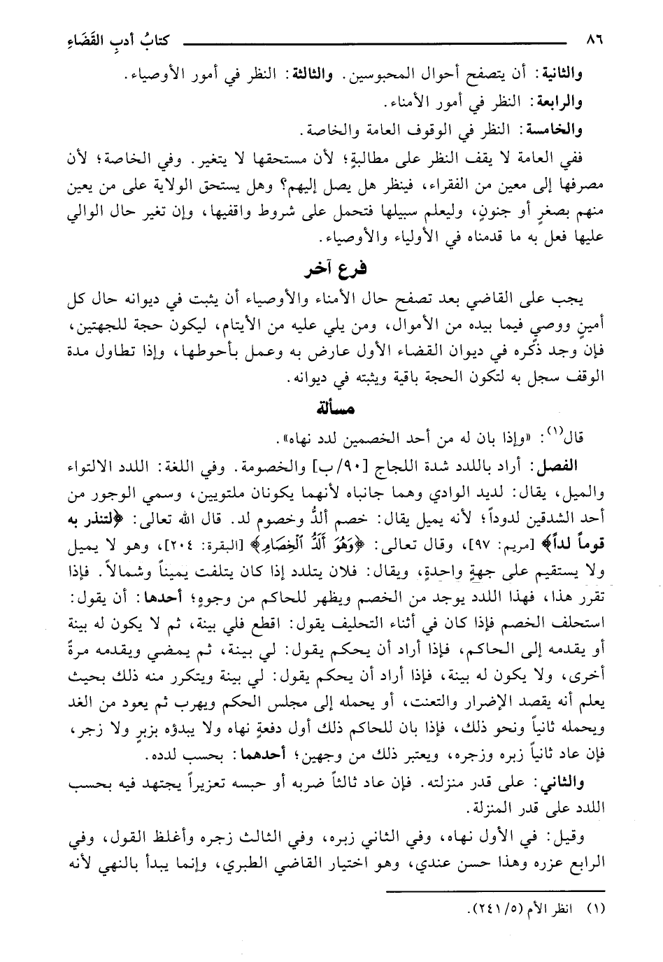 الفصل: أراد باللدد شدة اللجاج [90/ ب] والخصومة. وفي اللغة: اللدد الالتواء والميل، يقال: لديد الوادي وهما جانباه لأنهما يكونان ملتويين، وسمي الوجور من أحد الشدقين لدودًا؛ لأنه يميل يقال: خصم ألدُّ وخصوم لد. قال الله تعالى: {وَتُنذِرَ بِهِ قَوْمًا لُّدًّا} [مريم: 97]، وقال تعالى: {وَهُوَ أَلَدُّ الْخِصَامِ} [البقرة: 204]، وهو لا يميل ولا يستقيم على جهةٍ واحدةٍ، ويقال: فلان يتلدد إذا كان يتلفت يمينًا وشمالًا. فإذا تقرر هذا، فهذا اللدد يوجد من الخصم ويظهر للحاكم من وجوهٍ؛ أحدهما: أن يقول: استحلف الخصم فإذا كان في أثناء التحليف يقول: اقطع فلي بينة، ثم لا يكون له بينة أو يقدمه إلى الحاكم، فإذا أراد أن يحكم يقول: لي بينة، ثم يمضي ويقدمه مرةً أخرى، ولا يكون له بينة، فإذا أراد أن يحكم يقول: لي بينة ويتكرر منه ذلك بحيث يعلم أنه يقصد الإضرار والتعنت، أو يحمله إلى مجلس الحكم ويهرب ثم يعود من الغد ويحمله ثانيًا ونحو ذلك، فإذا بان للحاكم ذلك أول دفعةٍ نهاه ولا يبدؤه بزبرٍ ولا زجر، فإن عاد ثانيًا زبره وزجره، ويعتبر ذلك من وجهين؛ أحدهما: بحسب لدده.