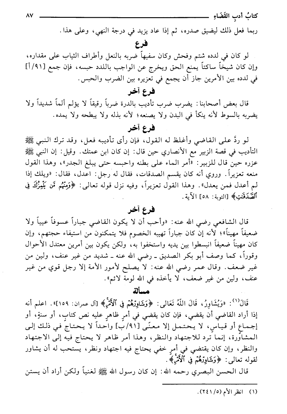 قَالَ: "وَيُشَاوِرُ، قَالَ اللهُ تَعَالى: {وَشَاوِرْهُمْ فِي الأَمْرِ} [آل عمران: 159] ". اعلم أنه إذا أراد القاضي أن يقضي، فإن كان يقضي في أمرٍ ظاهرٍ عليه نص كتابٍ، أو سنةٍ، أو إجماع أو قياسٍ، لا يحتمل إلا معنًى [91/ ب] واحدًا لا يحتاج في ذلك إلى المشاورة، إنما ترد للاجتهاد والنظر، وهذا أمر ظاهر لا يحتاج فيه إلى الاجتهاد والنظر، وإن كان يقتضي في أمر خفي يحتاج فيه اجتهاد ونظر، يستحب له أن يشاور لقوله تعالى: {وَشَاوِرْهُمْ فِي الأَمْرِ}.