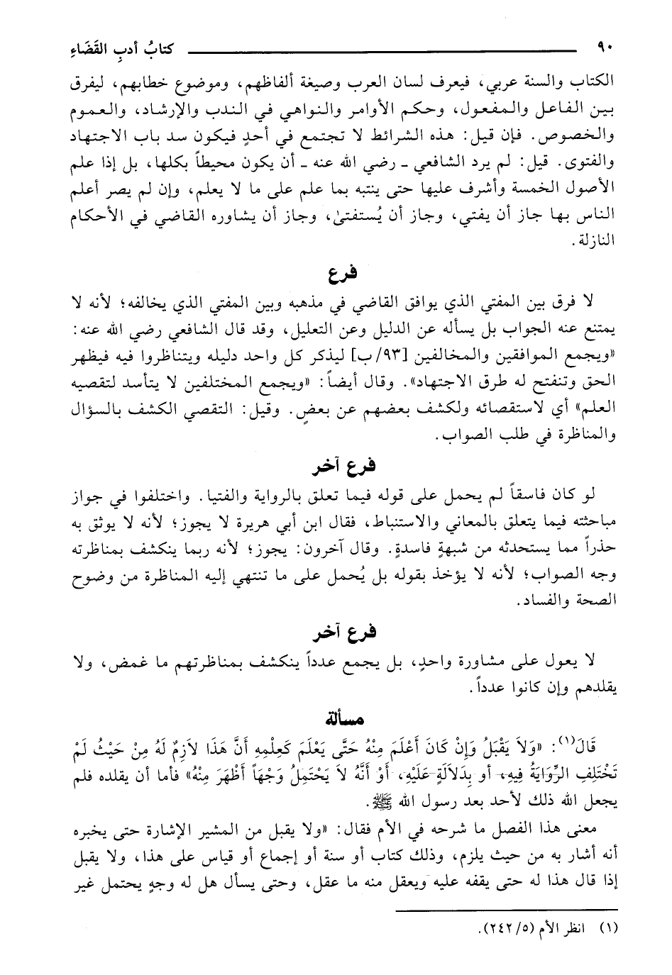 الكتاب والسنة عربي، فيعرف لسان العرب وصيغة ألفاظهم، وموضوع خطابهم، ليفرق بين الفاعل والمفعول، وحكم الأوامر والنواهي في الندب والإرشاد، والعموم والخصوص. فإن قيل: هذه الشرائط لا تجتمع في أحدٍ فيكون سد باب الاجتهاد والفتوى. قيل: لم يرد الشافعي -رضي الله عنه- أن يكون محيطًا بكلها، بل إذا علم الأصول الخمسة وأشرف عليها حتى ينتبه بما علم على ما لا يعلم، وإن لم يصر أعلى الناس بها جاز أن يفتي، وجاز أن يُستفتى، وجاز أن يشاوره القاضي في الأحكام النازلة.
