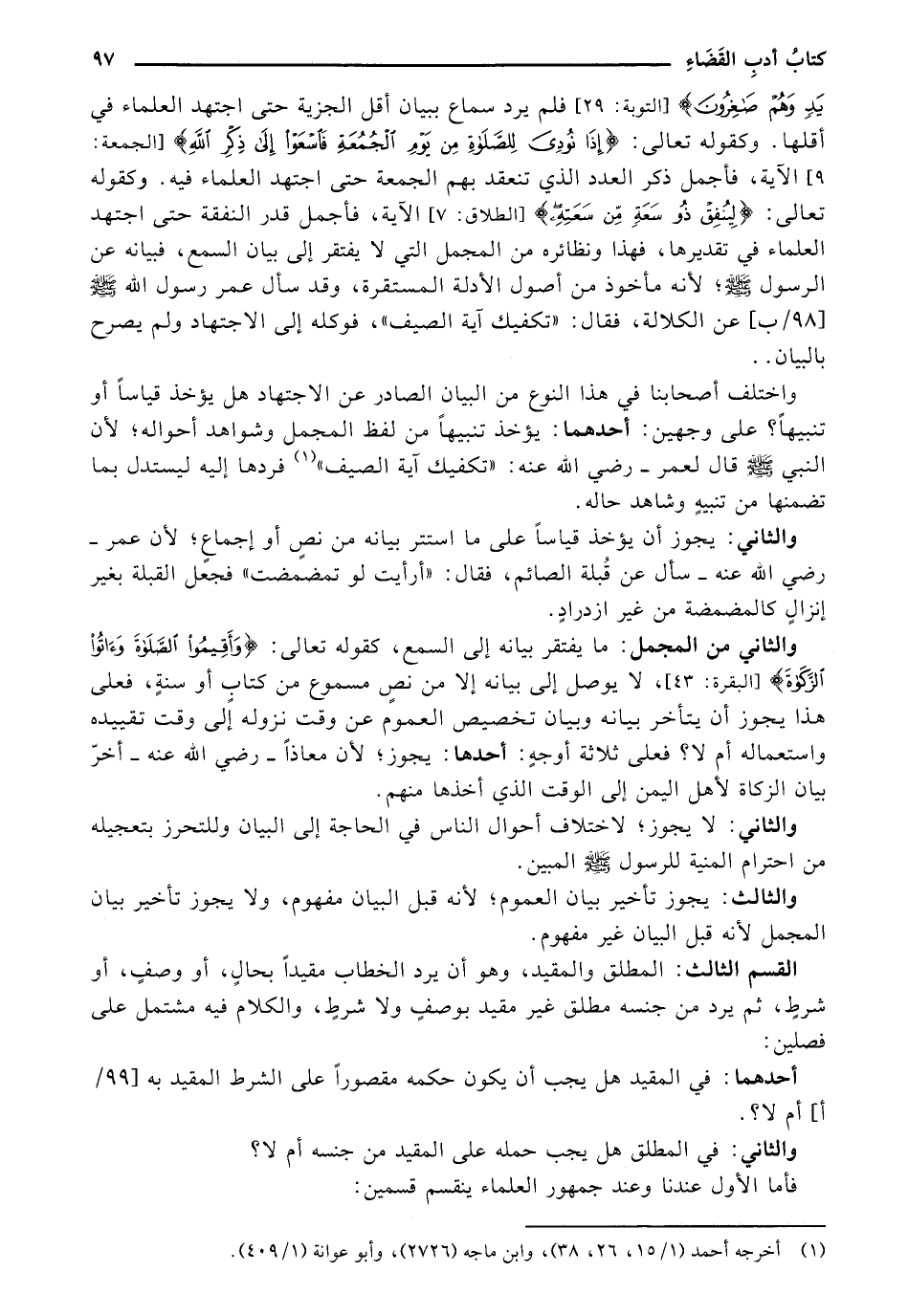 القسم الثالث: المطلق والمقيد، وهو أن يرد الخطاب مقيدًا بحال، أو وصف، أو شرط، ثم يرد من جنسه مطلق غير مقيد بوصف ولا شرط، والكلام فيه مشتمل على فصلين: