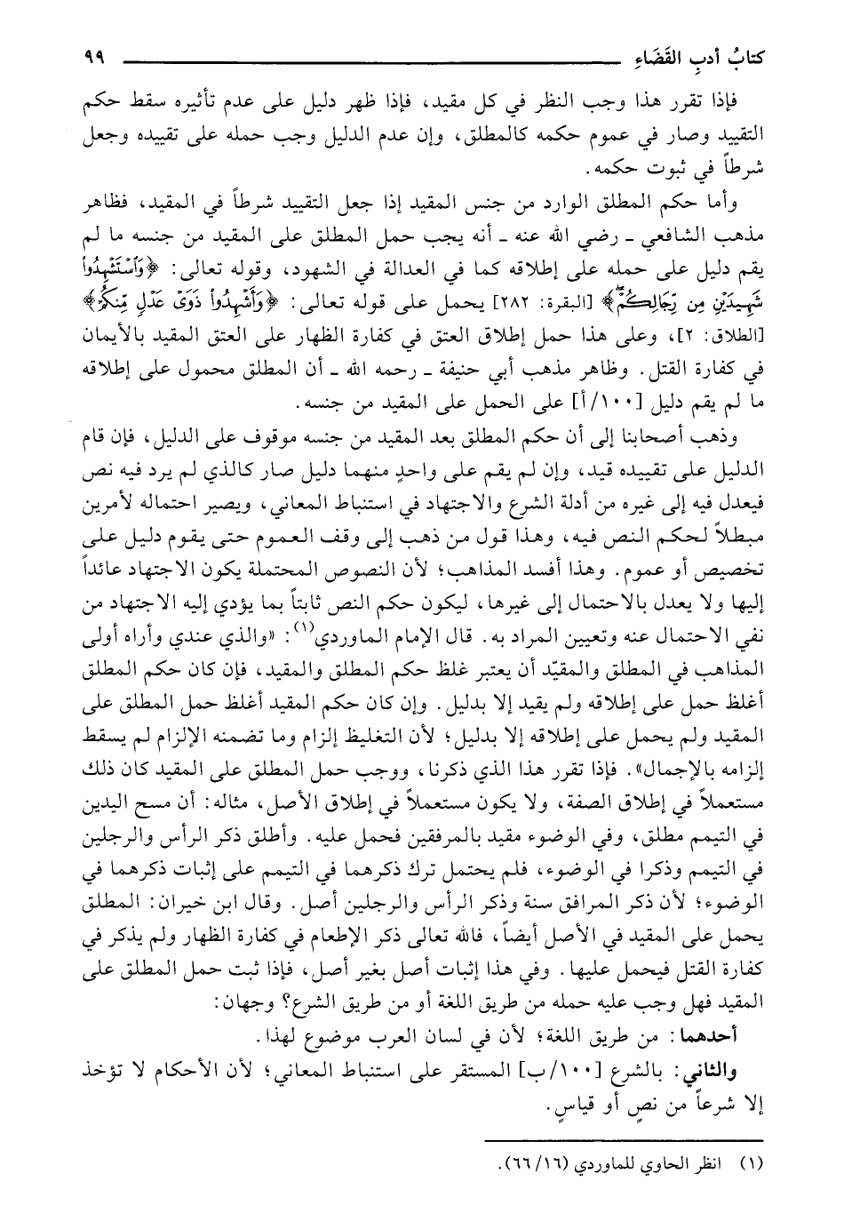 وذهب أصحابنا إلى أن حكم المطلق بعد المقيد من جنسه موقوف على الدليل، فإن قام الدليل على تقييده قيد، وإن لم يقم على واحد منهما دليل صار كالذي لم يرد فيه نص فيعدل فيه إلى غيره من أدلة الشرع والاجتهاد في استنباط المعاني، ويصير احتماله لأمرين مبطلاً لحكم النص فيه، وهذا قول من ذهب إلى وقف العموم حتى يقوم دليل على تخصيص أو عموم. وهذا أفسد المذاهب؛ لأن النصوص المحتملة يكون الاجتهاد عائدًا إليها ولا يعدل بالاحتمال إلى غيرها، ليكون حكم النص ثابتًا بما يؤدي إليه الاجتهاد من نفي الاحتمال عنه وتعيين المراد به. قال الإمام المارودي: "والذي عندي وأراه أولى المذاهب في المطلق والمقيّد أن يعتبر غلظ حكم المطلق والمقيد، فإن كان حكم المطلق أغلظ حمل على إطلاقه ولم يقيد إلى بدليل. وإن كان حكم المقيد أغلظ حمل المطلق على المقيد ولم يحمل على إطلاقه إلا بدليل؛ لأن التغليظ إلزام وما تضمنه الإلزام لم يسقط إلزامه بالإجمال". فإذا تقرر هذا الذي ذكرنا، ودب حمل المطلق على المقيد كان ذلك مستعملاً في إطلاق الصفة، ولا يكون مستعملاً في إطلاق الأصل، مثاله: أن مسح اليدين في التيمم مطلق، وفي الوضوء مقيد بالمرفقين فحمل عليه. وأطلق ذكر الرأس والرجلين في التيمم وذكرا في الوضوء، فلم يحتمل ترك ذكرهما في التيمم على إثبات ذكرهما في الوضوء؛ لأن ذكر المرافق سنة وذكر الرأس والرجلين أصل. وقال ابن خيران: المطلق يحمل على المقيد في الأصل أيضًا، فالله تعالى ذكر الإطعام في كفارة الظهار ولم يذكر في كفارة القتل فيحمل عليها. وفي هذا إثبات أصل بغير أصل، فإذا ثبت حمل المطلق على المقيد فهل وجب عليه حمله من طريق اللغة أو من طريق الشرع؟ وجهان: