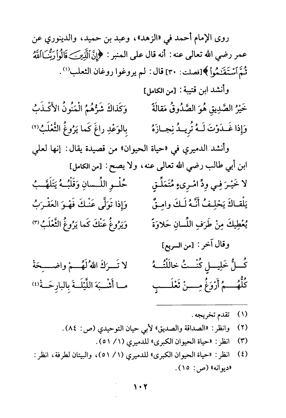روى الإِمام أحمد في "الزهد"، وعبد بن حميد، والدينوري عن عمر رضي الله تعالى عنه: أنه قال على المنبر: {إِنَّ الَّذِينَ قَالُوا رَبُّنَا اللَّهُ ثُمَّ اسْتَقَامُوا} [فصلت: 30] قال: لم يروغوا روغان الثعلب (¬1).