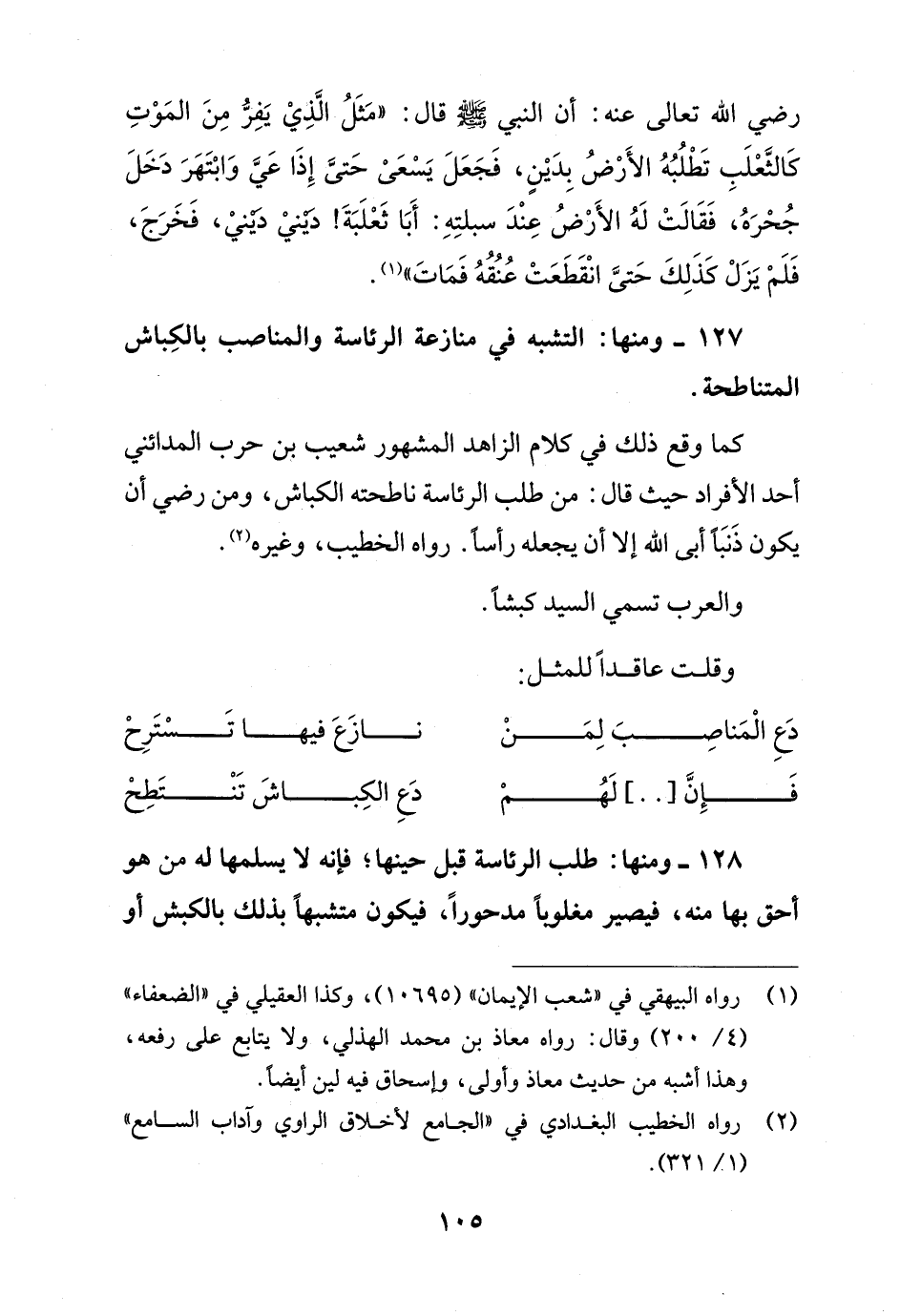 127 - ومنها: التشبه في منازعة الرئاسة والمناصب بالكِباش المتناطحة.