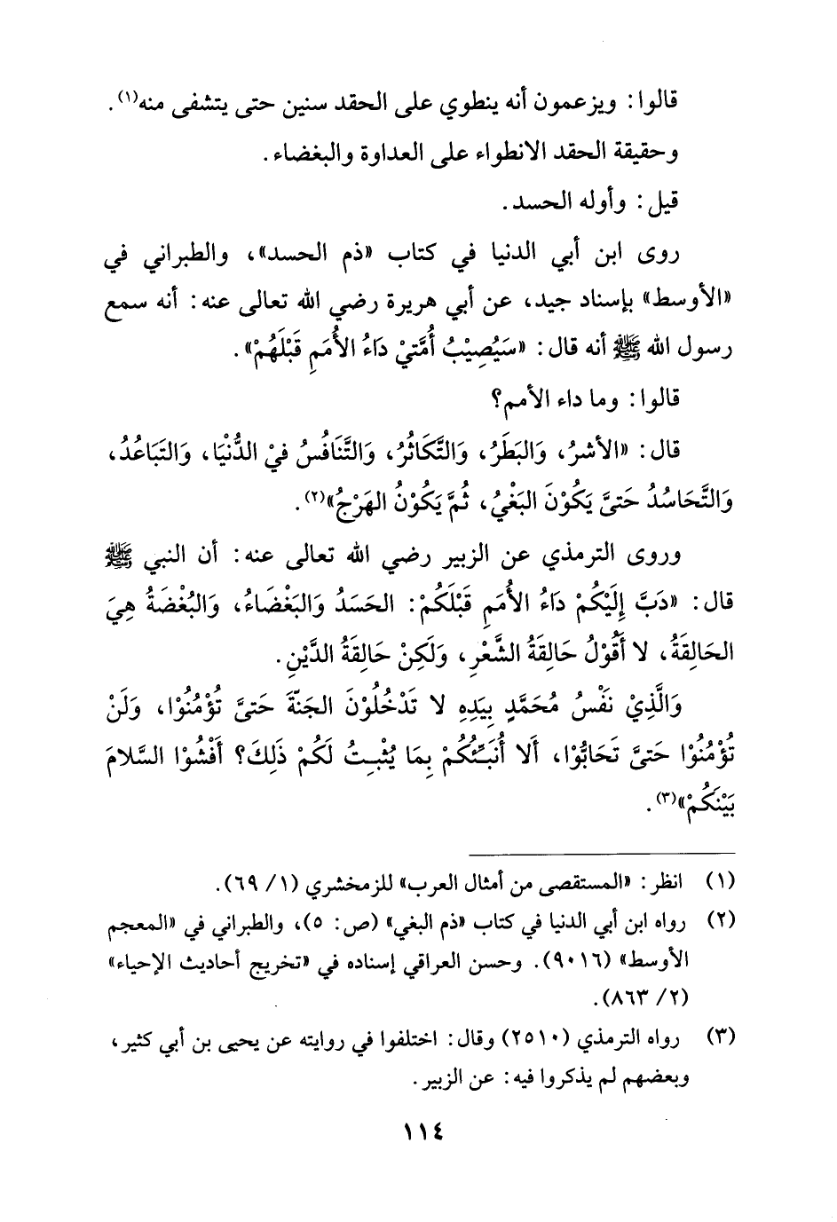 وروى الترمذي عن الزبير رضي الله تعالى عنه: أن النبي - صلى الله عليه وسلم - قال: "دَبَّ إِلَيْكُمْ دَاءُ الأُمَمِ قَبْلَكُمْ: الحَسَدُ وَالبَغْضَاءُ، وَالبُغْضَةُ هِيَ الحَالِقَةُ، لا أَقُوْلُ حَالِقَةُ الشَّعْرِ، وَلَكِنْ حَالِقَةُ الدَّيْنِ.