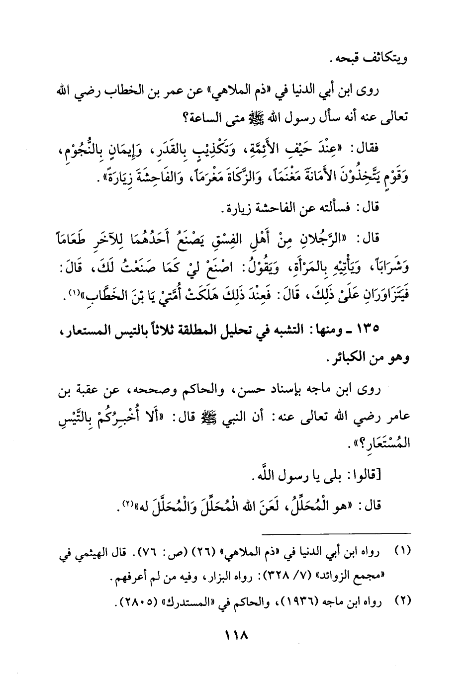 135 - ومنها: التشبه في تحليل المطلقة ثلاثًا بالتيس المستعار، وهو من الكبائر.