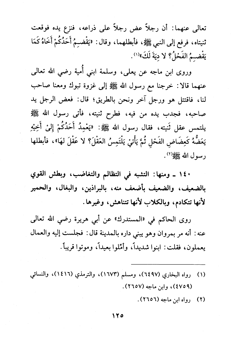 وروى ابن ماجه عن يعلى، وسلمة ابني أُمية رضي الله تعالى عنهما قالا: خرجنا مع رسول الله - صلى الله عليه وسلم - إلى غزوة تبوك ومعنا صاحب لنا، فاقتتل هو ورجل آخر ونحن بالطريق؛ قال: فعض الرجل يد صاحبه، فجدب يده من فيه، فطرح ثنيته، فأتى رسول الله - صلى الله عليه وسلم - يلتمس عقل ثَنيته، فقال رسول الله - صلى الله عليه وسلم -: "يَعْمِدُ أَحَدُكُمْ إِلىْ أَخِيْهِ يَعَضُّهُ كَعِضَاضِ الفَحْلِ ثُمَّ يَأْتيْ يَلْتَمِسُ العَقْلَ؟ لا عَقْلَ لهَا"، فأبطلها رسول الله - صلى الله عليه وسلم - (¬2).