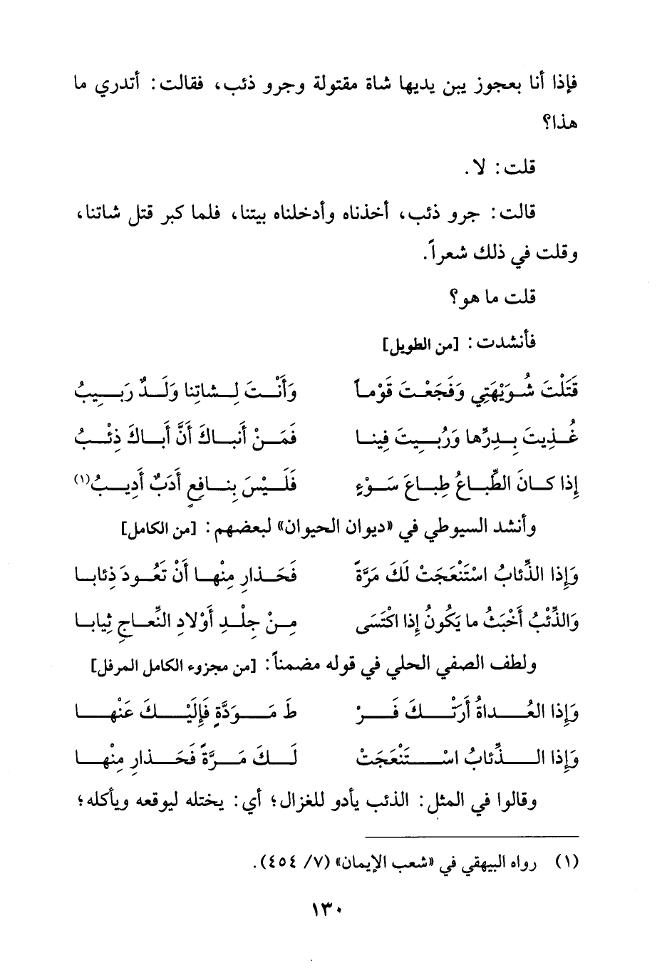 وَالذّئْبُ أَخْبَثُ ما يَكُونُ إِذا اكْتَسَى ... مِنْ جِلْدِ أَوْلادِ النِّعاجِ ثِيابا
